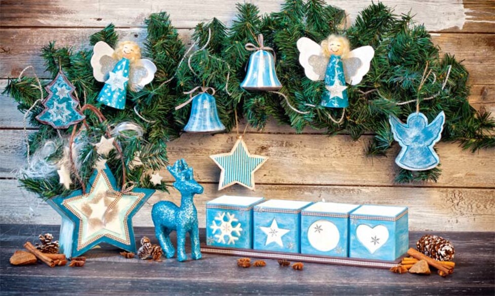 Paint the edges of the angel and star Ivory and tree Brown Paint the center of the angel Azure . Apply Decopatch Paper to the middle of the tree and star, remove excess material and seal with Patch varnish
