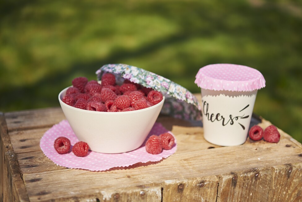 After Tex Wax has been applied and treated with heat (hairdryer or iron), it is absorbed into the fibres of the fabric and transforms the material into a reusable, breathable film. This can be shaped by the heat of the hands. In this way, countless covers can be produced for the most diverse cups, bowls and dishes. Tip: The whole thing also works for glasses, of course. Just cut out the fabric as usual, if necessary cut a hole in the middle for a straw and then coat it with wax. So insects have no chance to land in your drink!