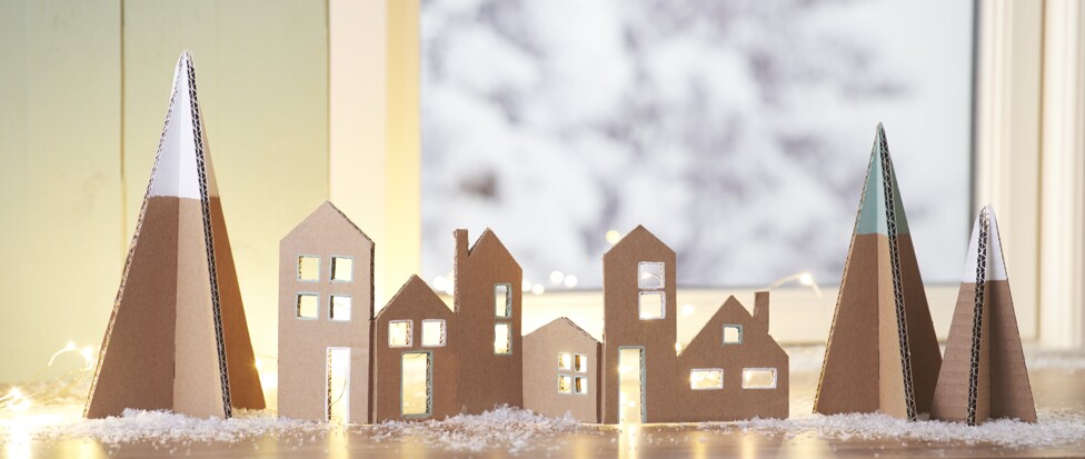 paint you can add some colour accents if necessary. Now plug the firs into each other. To connect the house fronts, take a piece of the remaining one Corrugated board and remove the first