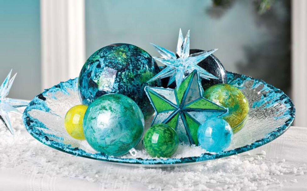 After drying, paint the decorative snow with turquoise blue Handicraft paint and spread with glitter paste in the colour Moonstone . Cover the bottom of the glass bowl with Diamond-snow and arrange the Acrylic balls and stars decoratively.