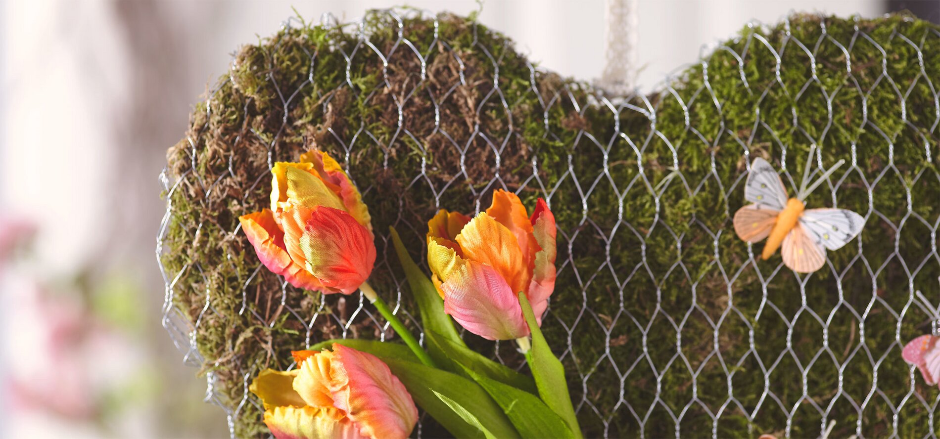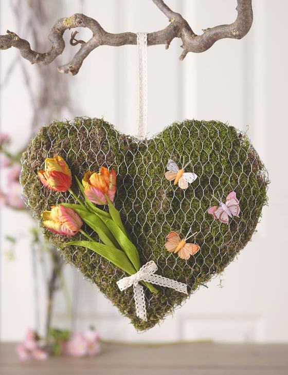 Arrange any flowers, Decorative ribbons, butterflies or other decorations on the heart, fix it with hot glue or tie it up. Finally, tie ribbon to the heart for hanging