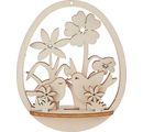 The Wood building kit Decoration pendant egg "Birds and flowers" has a size of approx. 10 cm x 12 cm x 0.4 cm. It is put together from 7 individual parts. At the top of the egg there is a hole (2 mm) to thread a ribbon. The material is poplar plywood.