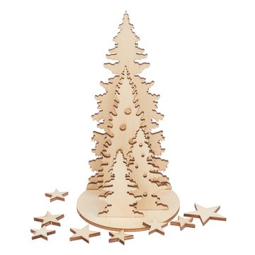 Wooden building kit "Gnome with fir" made of plywood with a size of approx. 8.4 cm, Ø 6 cm. Included are two plug-in motifs with 8 parts each for plugging and gluing. For a secure stand, the stand parts should be additionally fixed with glue (not included). Then glue on the stars and lantern. On the packaging is a picture of the finished gnomes as a construction aid.