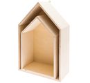 Beautiful wooden shelf "House" in a set of 2 in two sizes made of poplar plywood. The big house has a size of approx. 21,5 x 32,5 x 10 cm and the small house of approx. 17 x 26 x 10 cm. The inside dimensions of the two houses are approx. 20 x 31.6 x 10 cm and approx. 16 x 24 x 10 cm