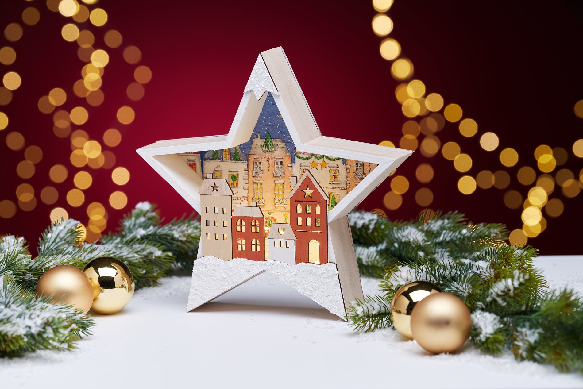 Now glue the star to the back wall. If the back wall has visually unattractive edges on the side of the star, sand these visible edges smooth. Attach the chain of light to the underside of the star using hot glue dots. Finally, glue the house facade and the small decorative element onto the wooden star.