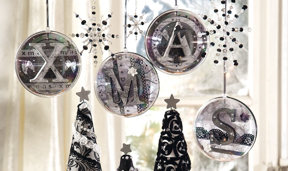 Paint Handicraft paint the edges of the MDF letters with white and black. Glue the different papers onto the letters with glue stick and cut off any protruding edges with the tweezer scissors. Cut the papers to size to fit the cutting discs (apply the circumference with a compass) and glue them on with a glue stick. Decorate the cutting discs and the letters with ribbons, bows, gemstones, glitter liner etc. Glue the letters onto the cutting discs with hot glue, place them in one half of a sphere and join them together with the other half. Stick the design tapes over the seam with tape-Ribbon . Satin ribbon Hang up the balls with them.