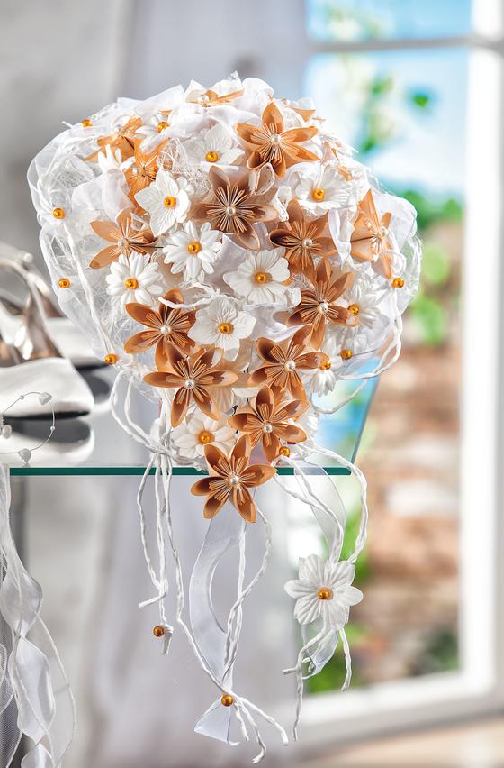 Ritagliare dalla carta colorata circa 120 quadrati di 7 x 7 cm ciascuno. Piegare i quadrati di carta in diagonale, quindi piegare i due angoli verso la punta. Piegare le due ali verso l'esterno in direzione del bordo, piegare le due ali verso l'alto come a formare un sacchetto e poi premere in piano. Piegare le punte delle ali verso il basso, ripiegare le ali verso l'interno per formare un altro quadrato. Incollare l'ala destra all'ala sinistra, quindi unire 6 elementi con il nastro adesivo per formare un fiore.