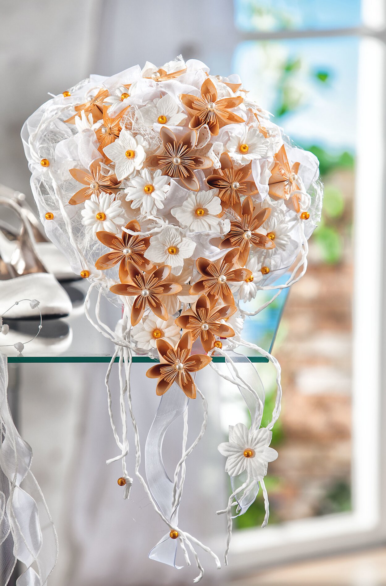 Arrotolare la seta di paglia bianca, la seta a fibra grossa o un tessuto di pizzo in un sacchetto, incollare il filo di supporto e una perlina al centro. Con il taglierino praticare un foro profondo circa 2 cm nella palla e incollarvi con la colla a caldo un tondino lungo 20 cm. Piegare la fibra di seta nel senso della lunghezza e fissarla con spilli a fiore di paglia intorno al tondino sotto la palla. Accorciare i fili delle singole parti e inserirli nella palla in tondi ravvicinati.