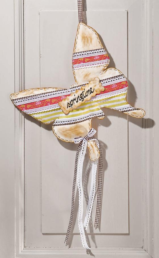 A questo punto, posizionare le due farfalle una sopra l'altra e attaccare un nastro pendente tra di esse. Quindi cucite insieme le due parti con il filo da ricamo e imbottite la farfalla con dell'ovatta. Ora potete scrivere sulla targhetta e sottolineare tutti i bordi con il tampone d'inchiostro marrone. Incollate la targhetta e decorate la farfalla finita con fiocchi realizzati con nastro a quadretti e pizzo a tombolo, lasciando le estremità lunghe.