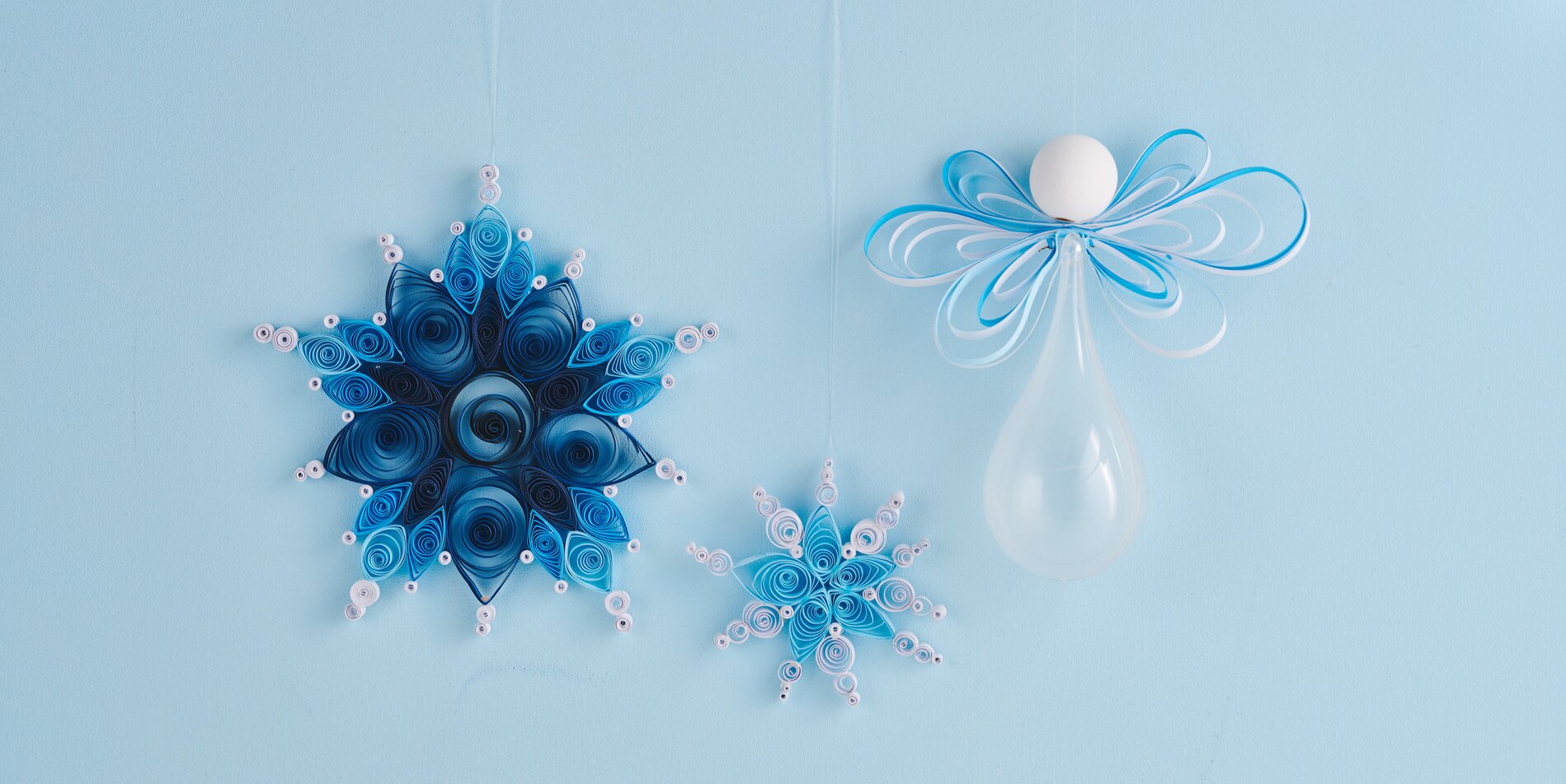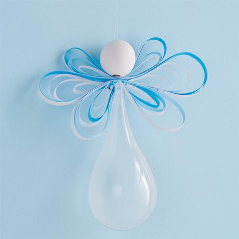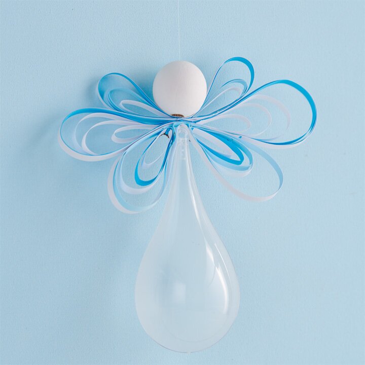 Annodare il filo di nylon all'anello di sospensione. Infilare l'estremità in un ago. Spingere l'ago attraverso il centro delle ali e tirare la pallina di legno. Annodare l'estremità del filo in un cappio.