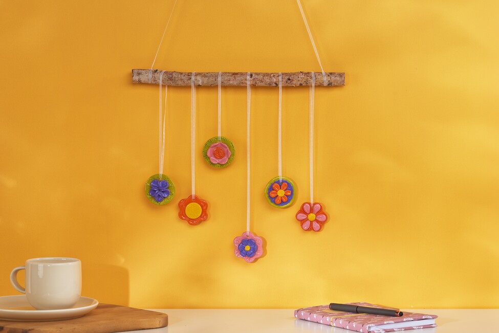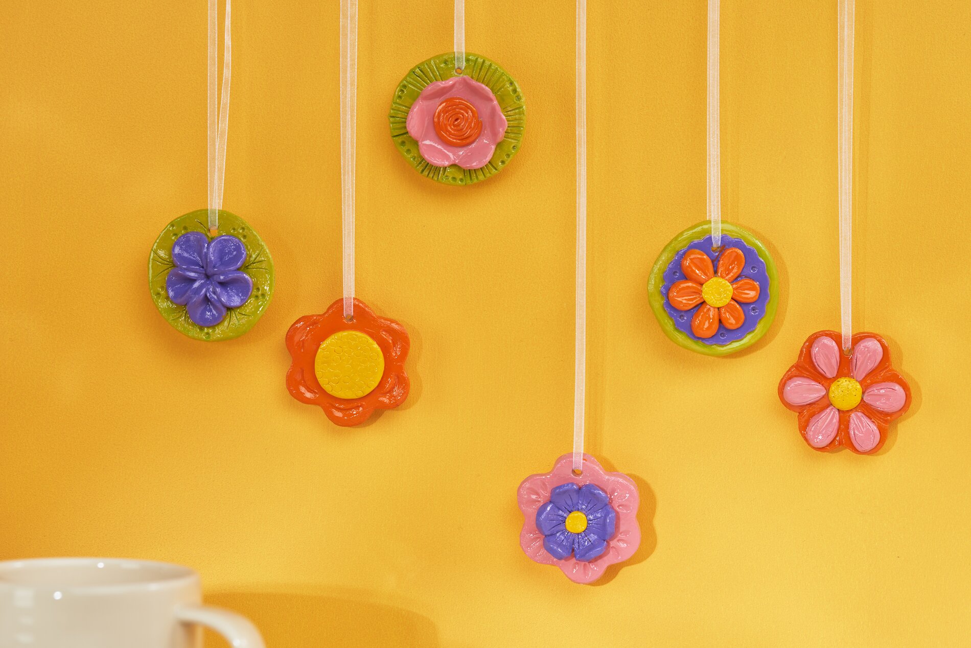 Ora dipingete i fiori di argilla con colori artigianali nei vostri colori preferiti e finite con una vernice tripla lucida. Questo renderà i ciondoli resistenti alle intemperie e darà loro anche una grande lucentezza, come nel caso della ceramica cotta e smaltata.
