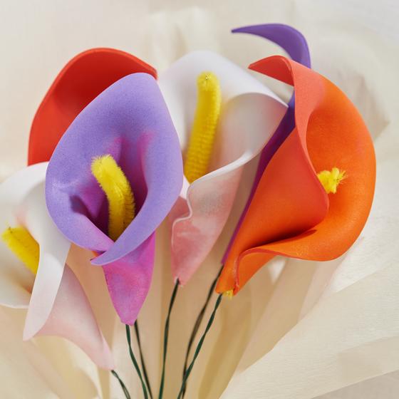 Utilizzare colori coordinati per creare una sfumatura di colore morbida sui fiori. Usare il rosa scuro per il fiore bianco, mescolare arancione e giallo per il fiore rosso e usare il rosa per il fiore viola. Questi colori daranno al fiore profondità e vivacità. Tagliare il filo di ciniglia in sei pezzi uguali. Come per le margherite, avvolgere due pezzi di filo di ferro insieme per formare un gambo robusto. Applicare una striscia di colla a caldo al centro dell'estremità inferiore del fiore e fissare il gambo. Fissare anche l'estremità del filo di ciniglia con la colla a caldo. Incollare i lati del fiore al centro per imitare la tipica forma della calla. Asciugare con cura il fiore dal retro, in modo che il calore pieghi leggermente la gommapiuma verso l'esterno e dia al fiore una curva elegante.