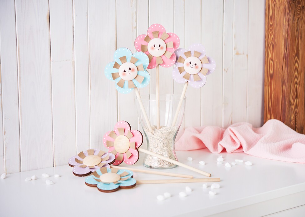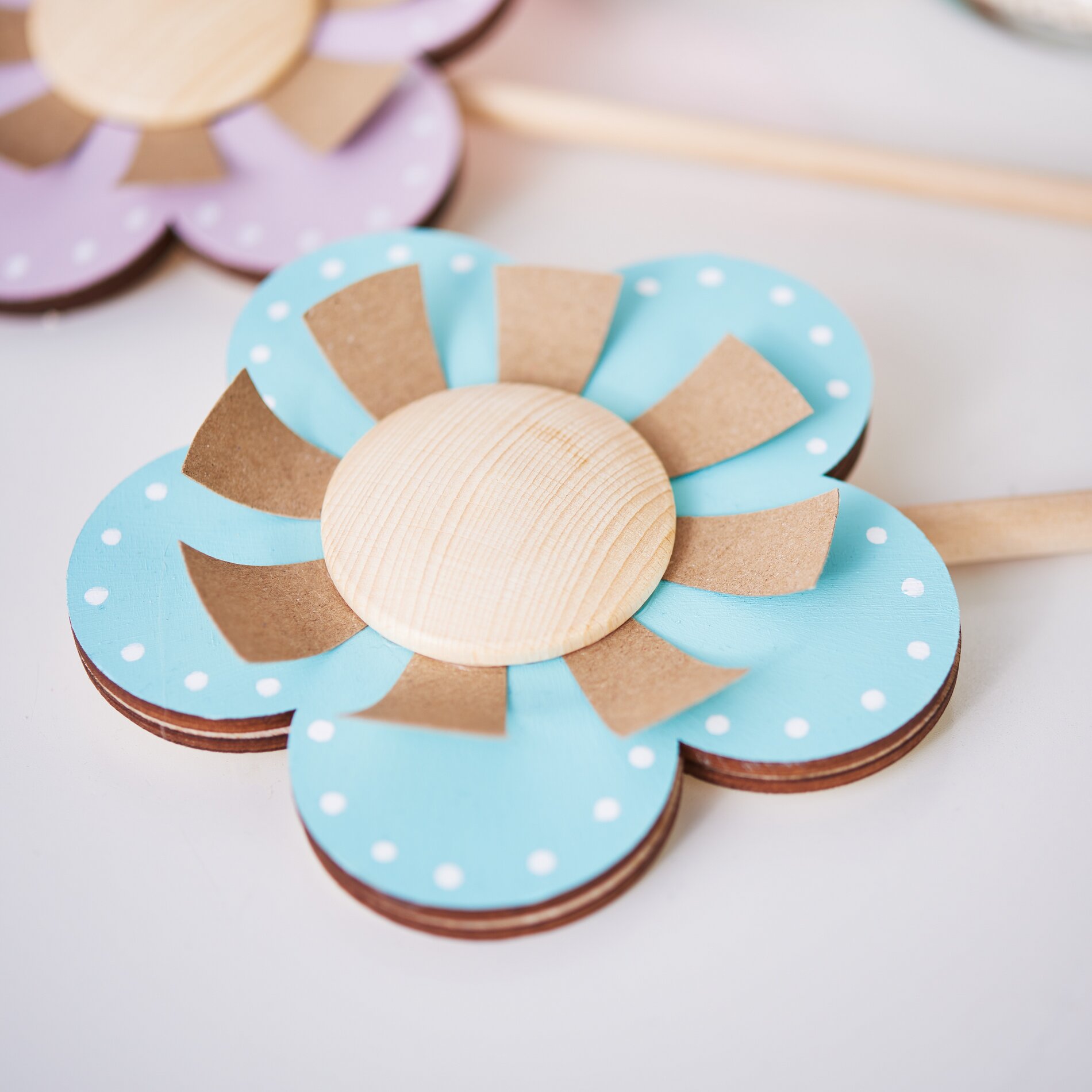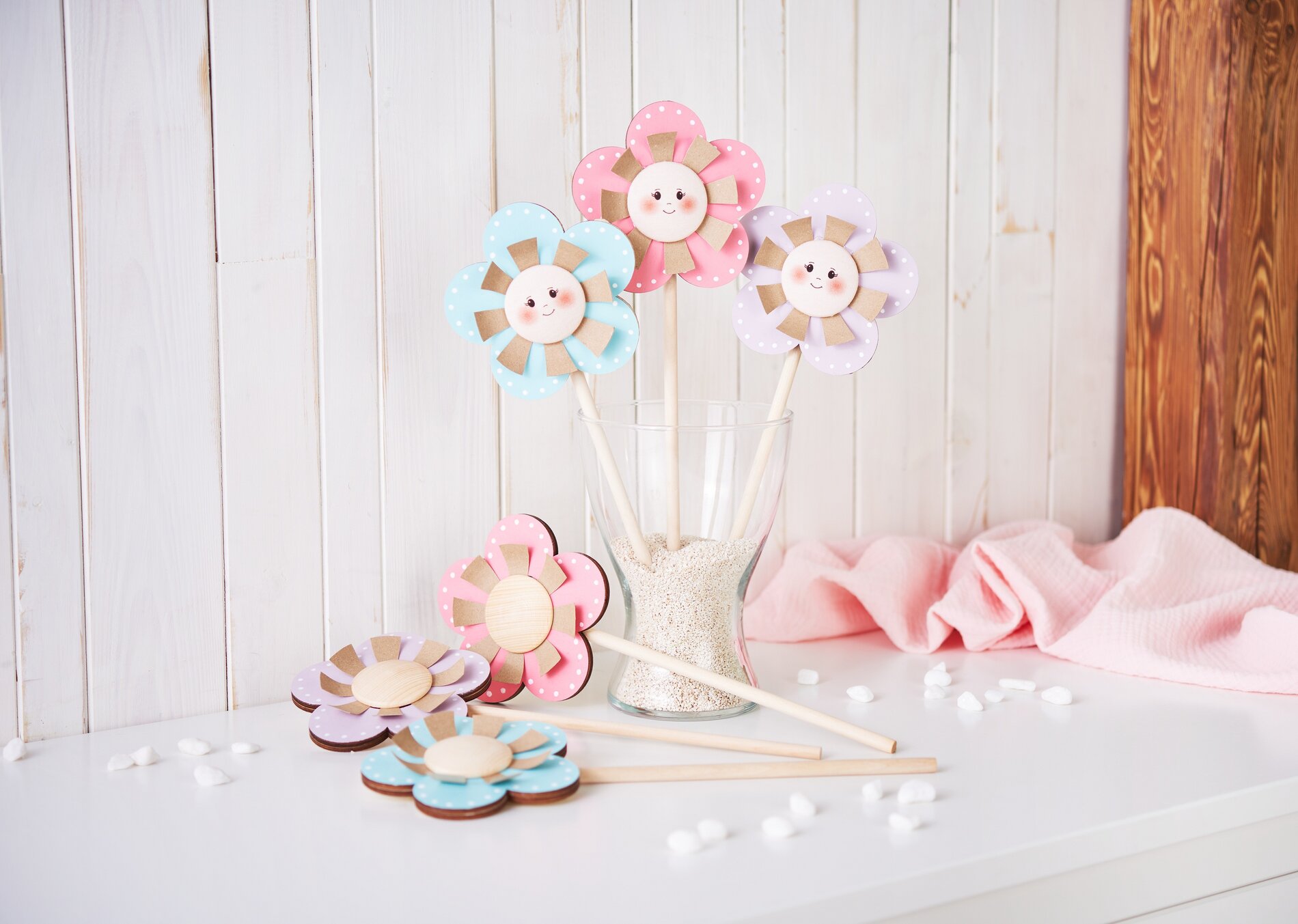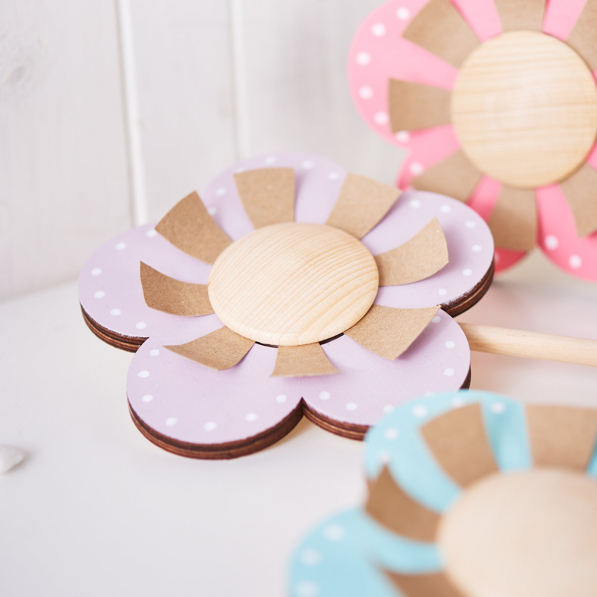 Prendete tre fiori di carta kraft ritagliati e incollate una tavola di legno al centro di ognuno.