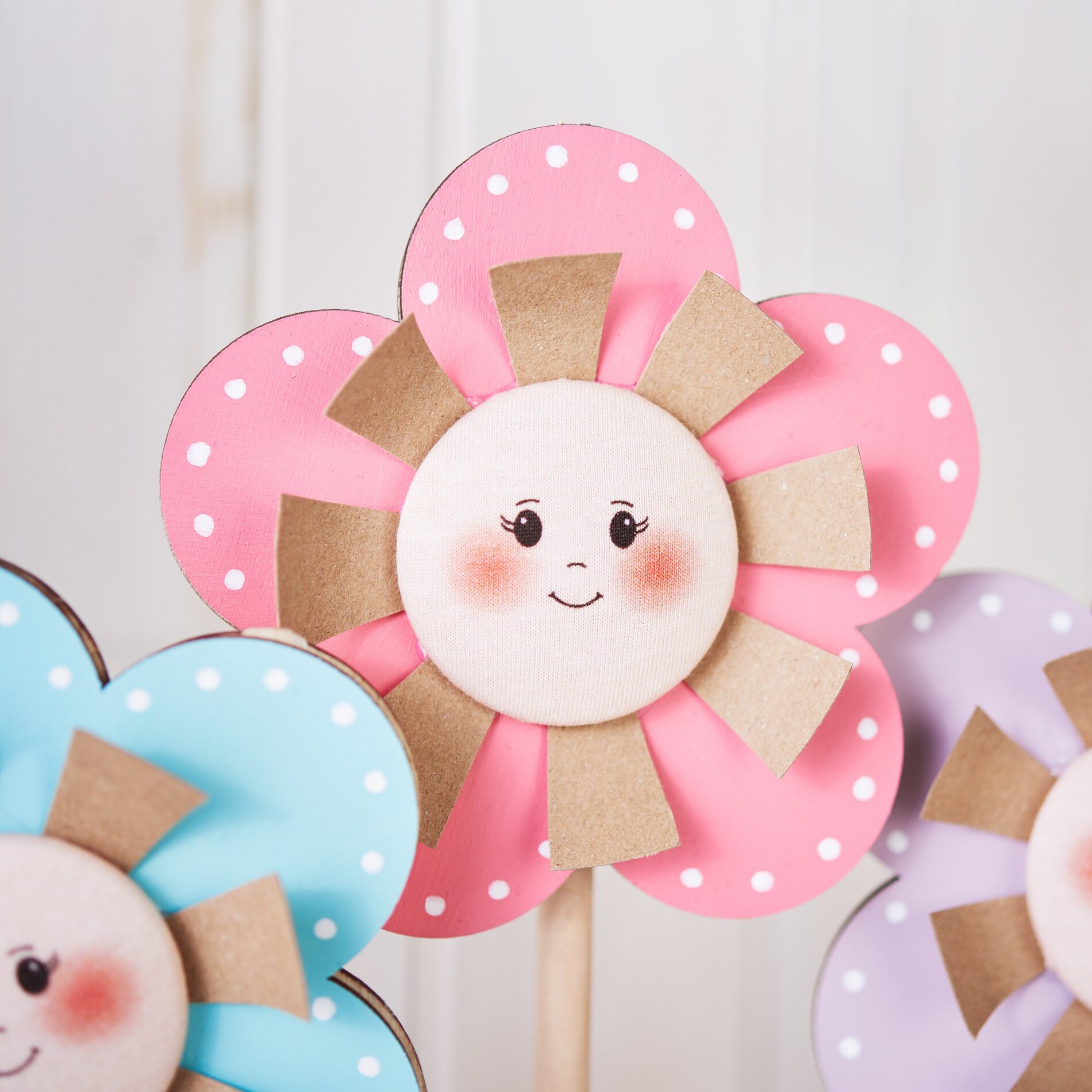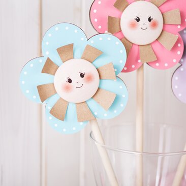 Incollare ora i fiori di carta kraft preparati con le facce di legno al centro dei fiori dipinti. Assicurarsi che tutto sia ben saldo per evitare che si muovano.