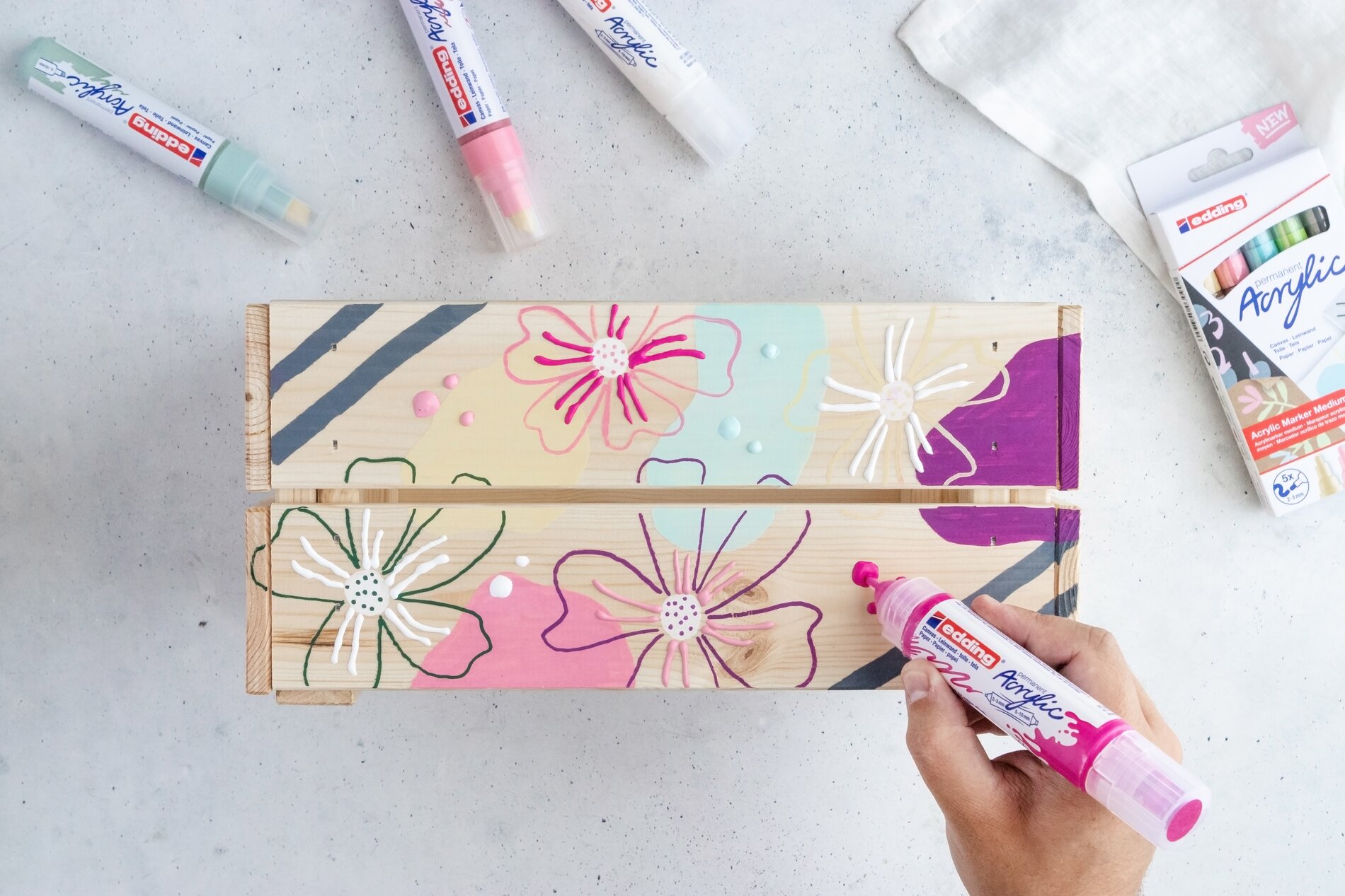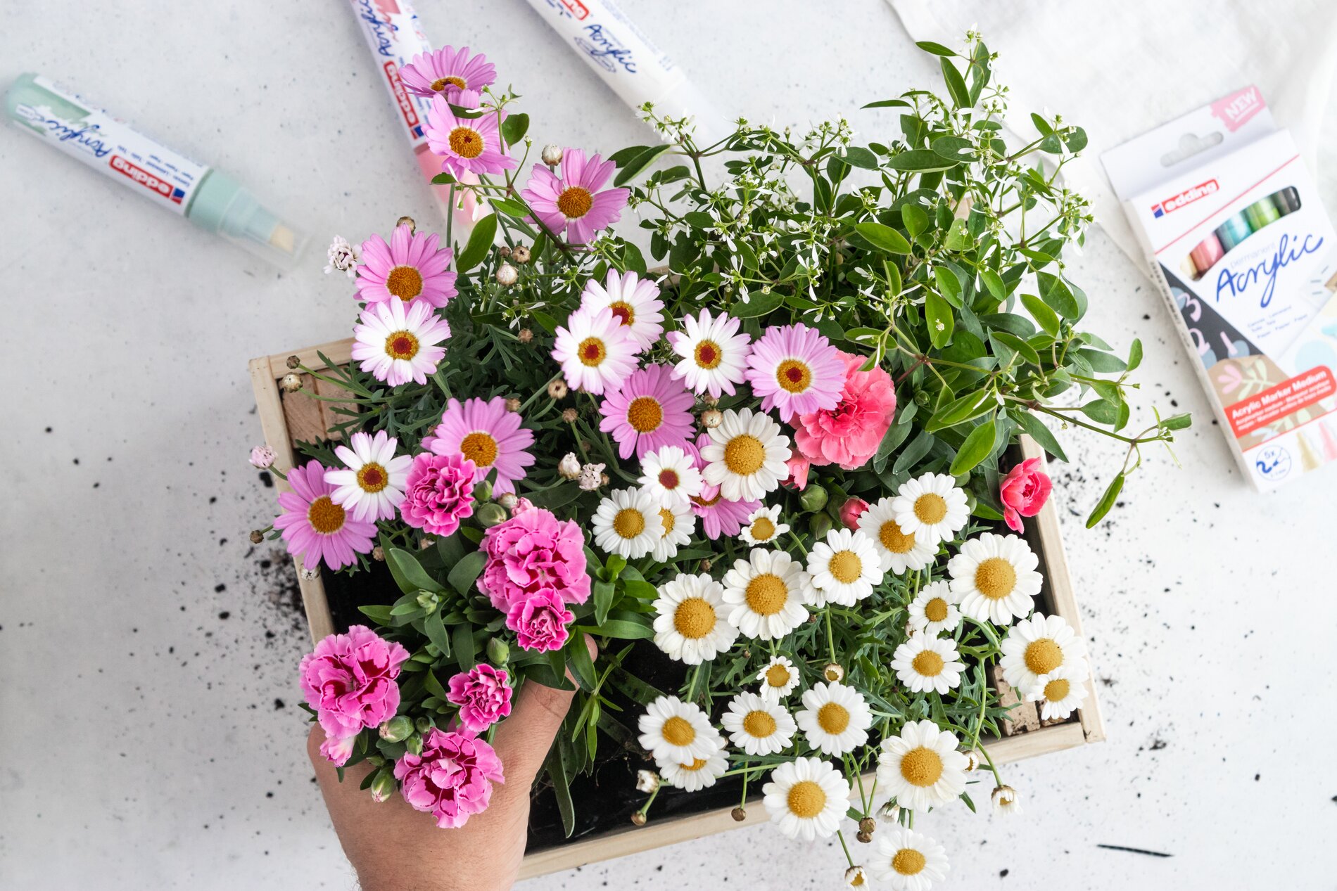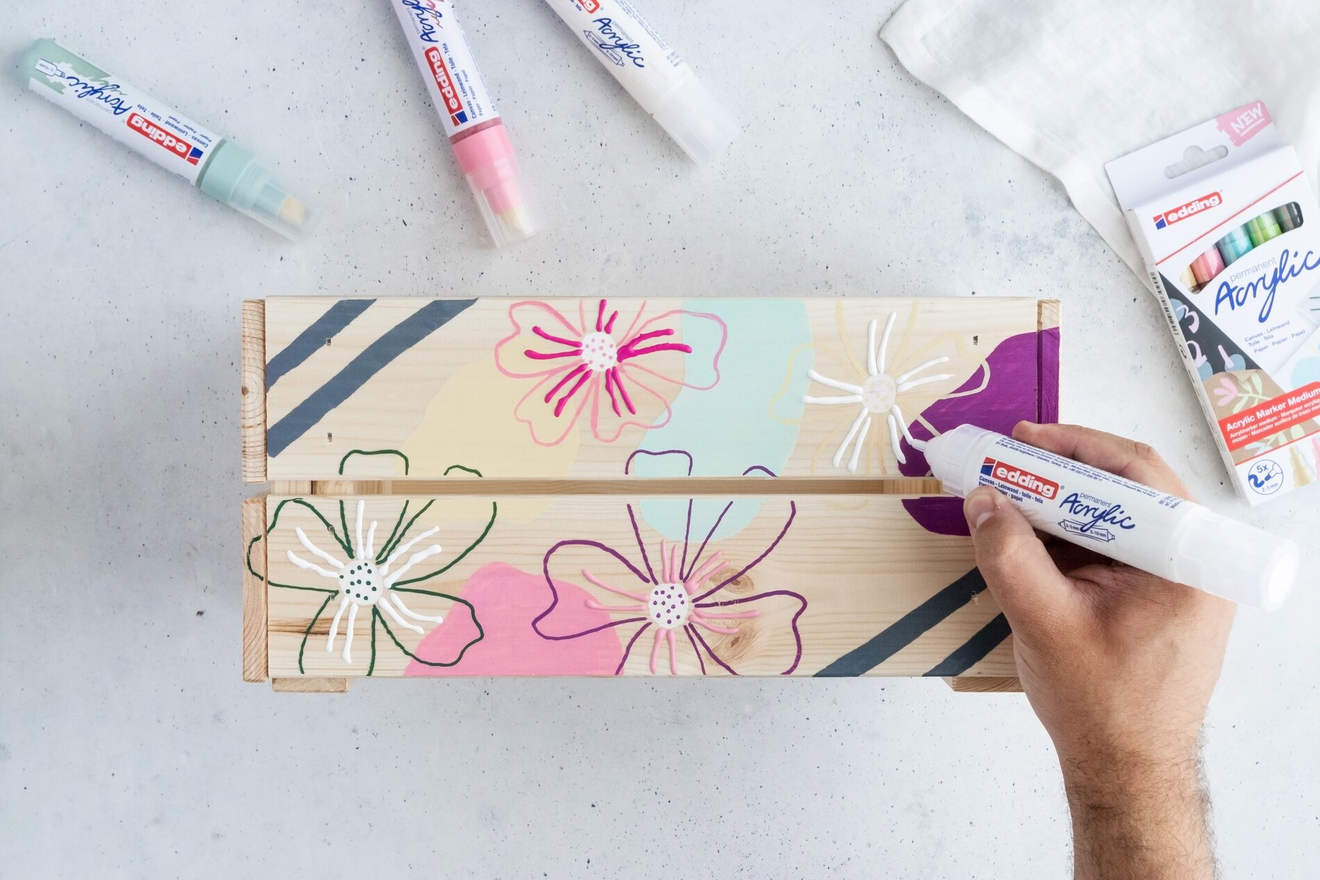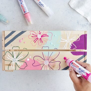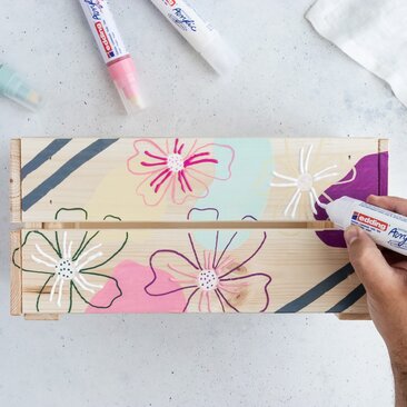 Create una fioriera colorata per i vostri fiori preferiti con poco sforzo e pochi prodotti. La cassetta di legno è stata disegnata semplicemente con vari pennarelli acrilici per bordi, poi è stata rivestita con un foglio di alluminio e piantata con graziosi fiori. Un'ottima idea per l'estate!