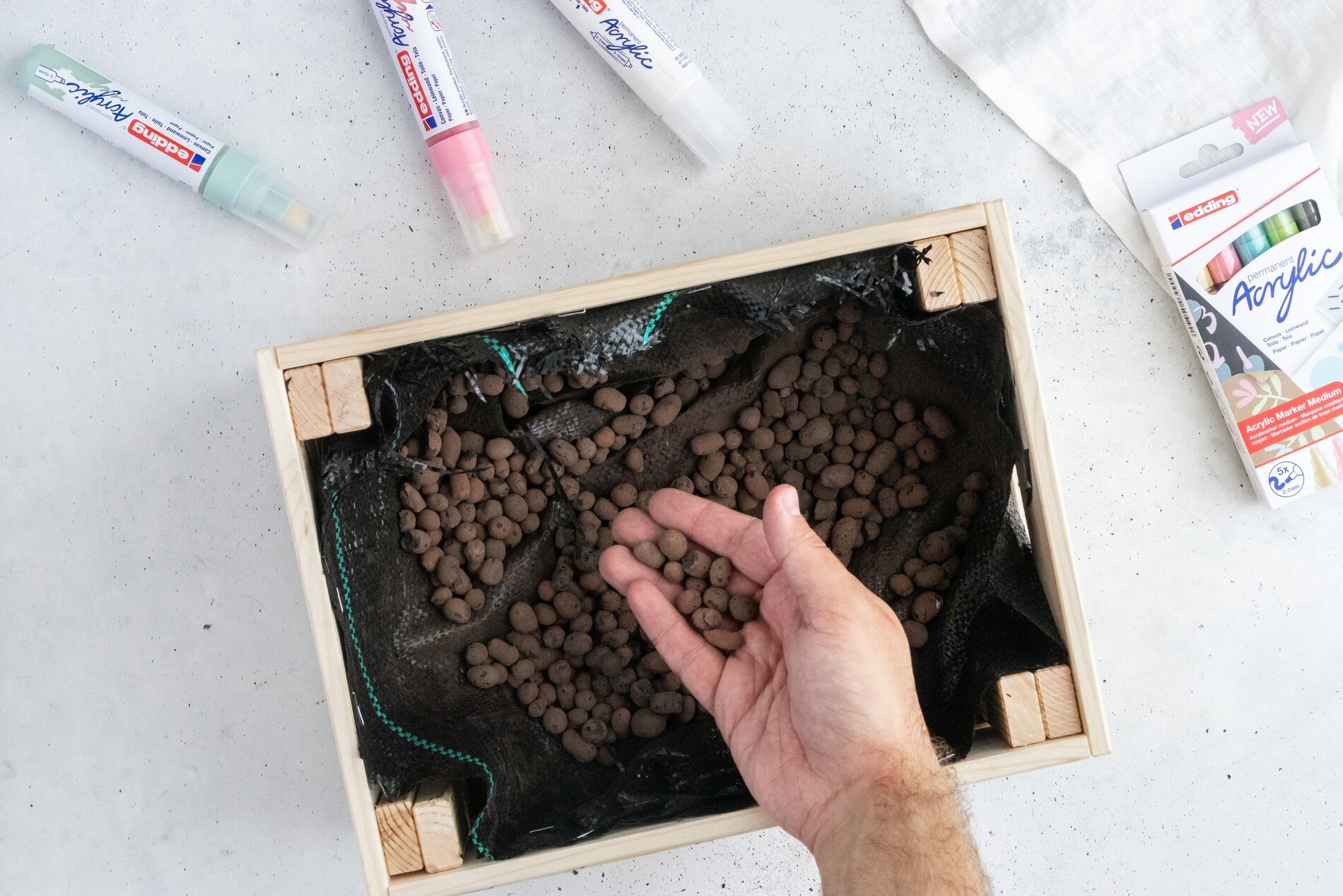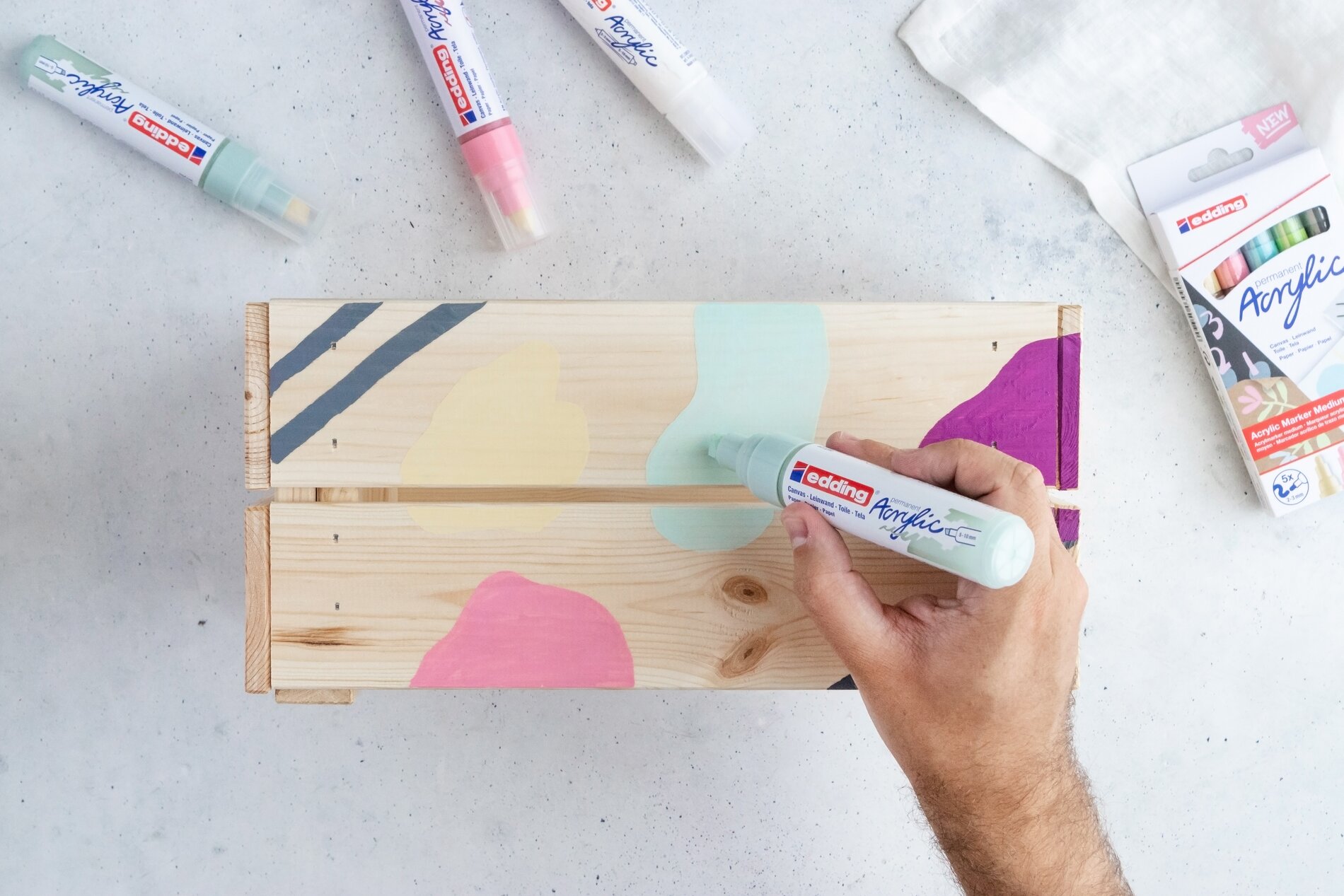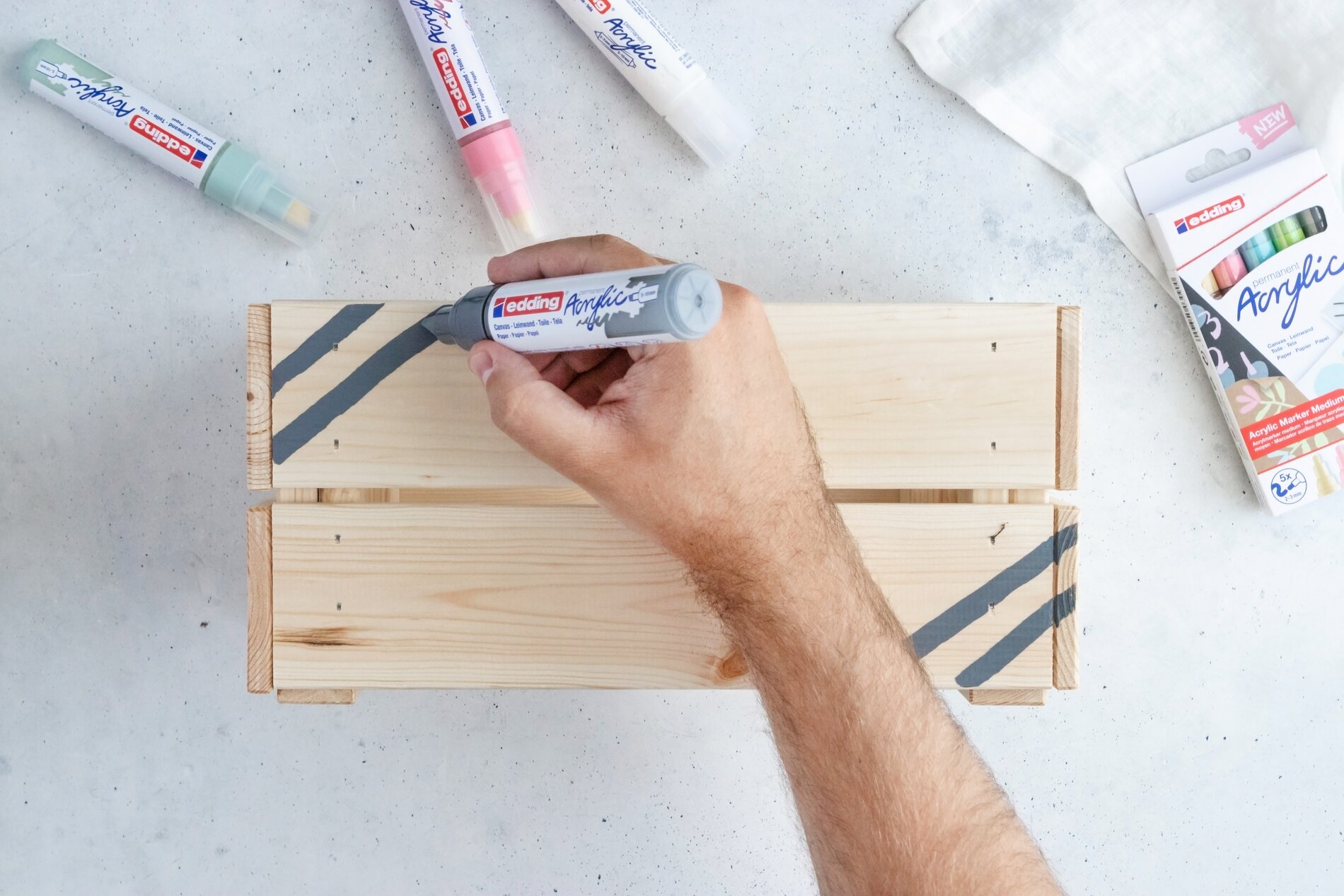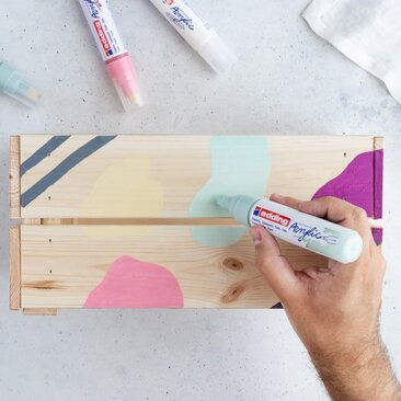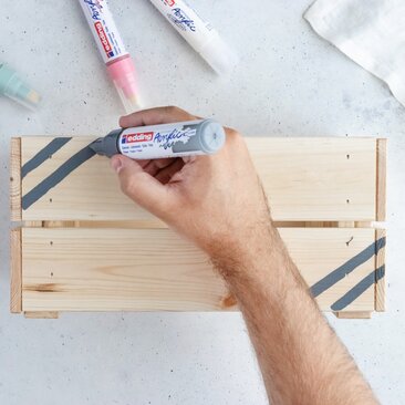 Create una fioriera colorata per i vostri fiori preferiti con poco sforzo e pochi prodotti. La cassetta di legno è stata disegnata semplicemente con vari pennarelli acrilici per bordi, poi è stata rivestita con un foglio di alluminio e piantata con graziosi fiori. Un'ottima idea per l'estate!