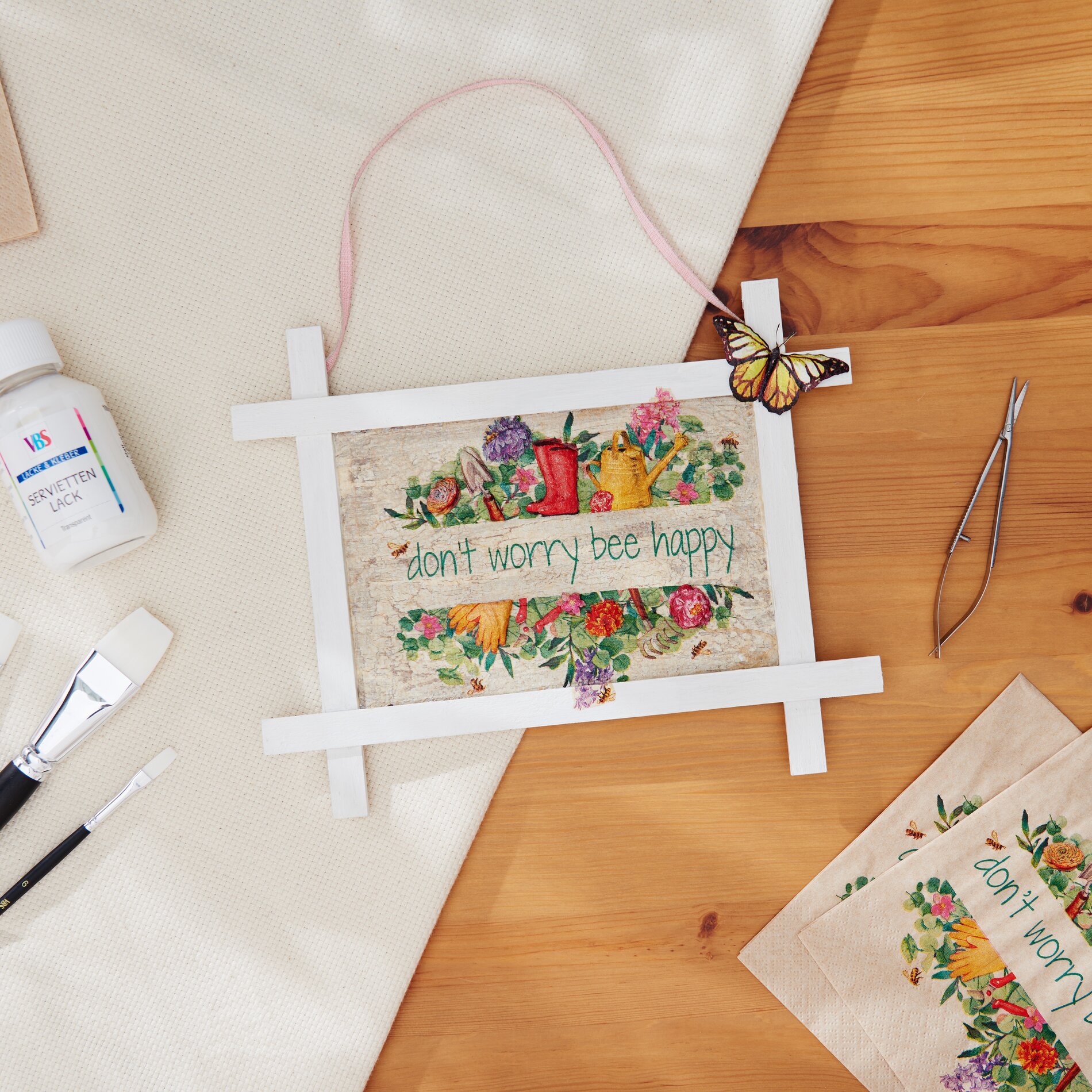 Quindi strappare il motivo dal tovagliolo. Quando tutto è asciutto, dipingere la sezione dell'immagine con la vernice per tovaglioli e incollarvi sopra lo strato superiore stampato del tovagliolo. Quindi rivestire nuovamente il tutto con la vernice per tovaglioli.