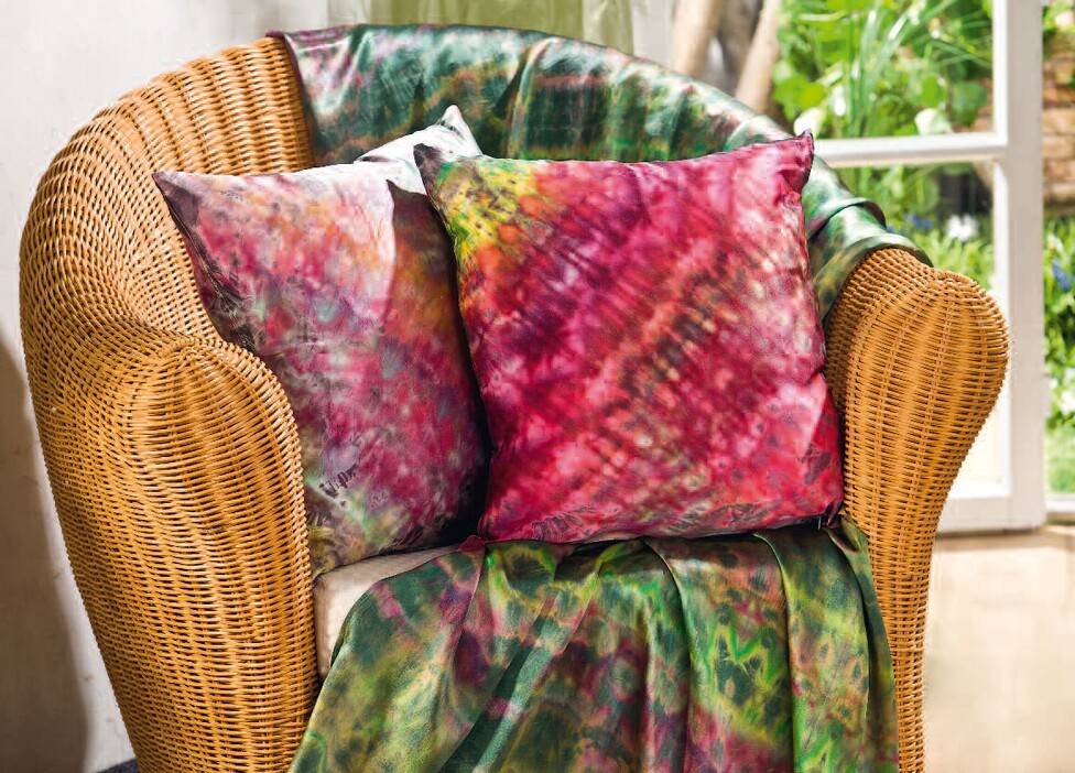 Con vernici per seta di alta qualità e le tecniche giuste, non è affatto difficile trasformare il tessuto bianco in pezzi unici decorativi. In questo caso, le fodere dei cuscini e le coperte sono state create utilizzando solo 3 diversi colori di vernice di seta fissabili a vapore. L'ingegnosa tecnica di avvolgimento e il fissaggio a bagnomaria creano affascinanti effetti cromatici e motivi.