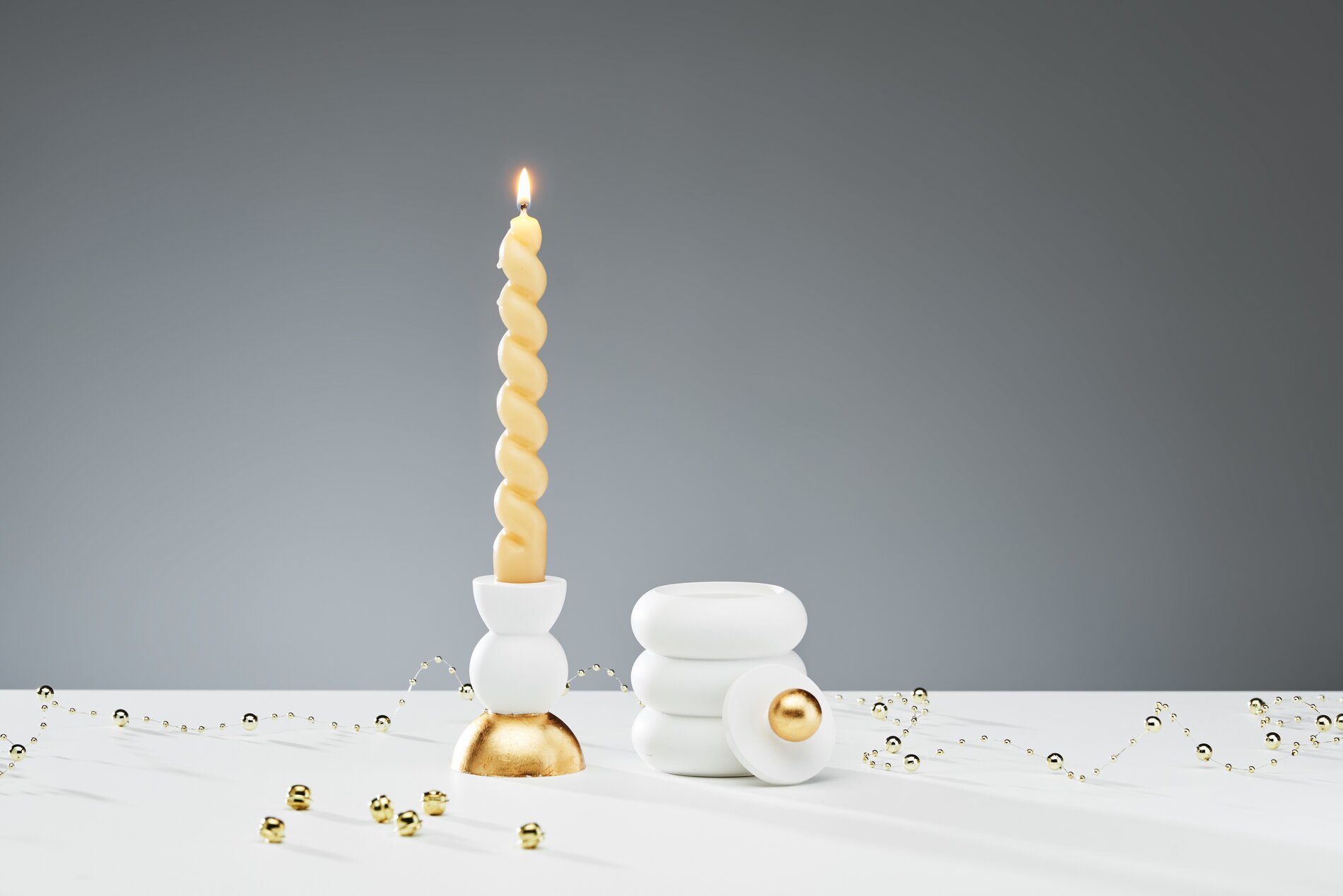 Suggerimento: fissare le candele Se la candela a colonna ha un diametro troppo grande, è possibile regolarla con un temperino per candele. Per tenere la candela saldamente in posizione, posizionare un disco di cera adesivo alla base dello stampo.