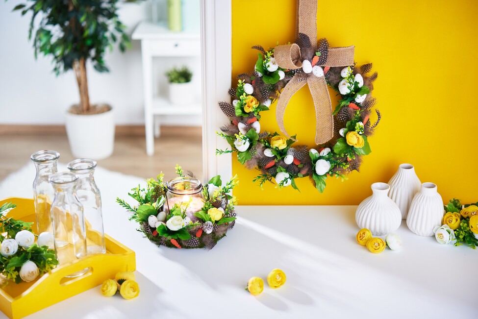 Incollate le uova di polistirolo e fissate con spilli o colla anche le piume. Ora non resta che incollare le carote e posizionare una lanterna al centro della ghirlanda piccola.
