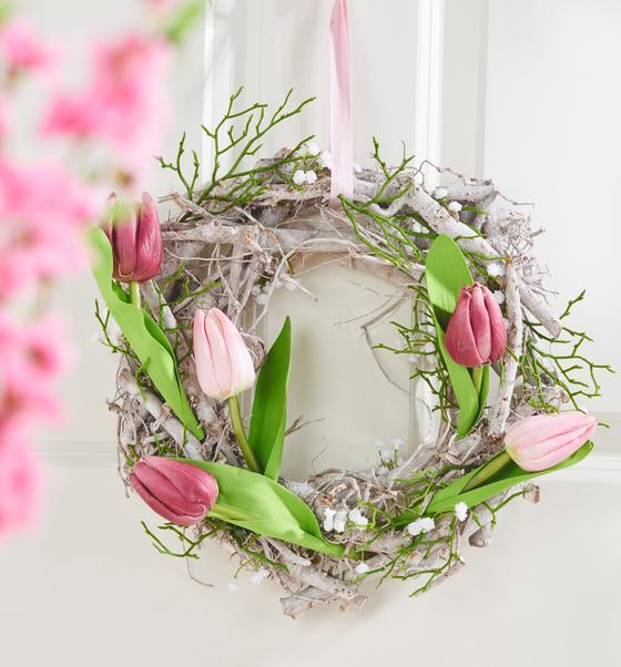 Disponete sulla corona tulipani, gypsophila e rami di mirtillo secondo il vostro gusto personale. Fissate il tutto con la colla a caldo.