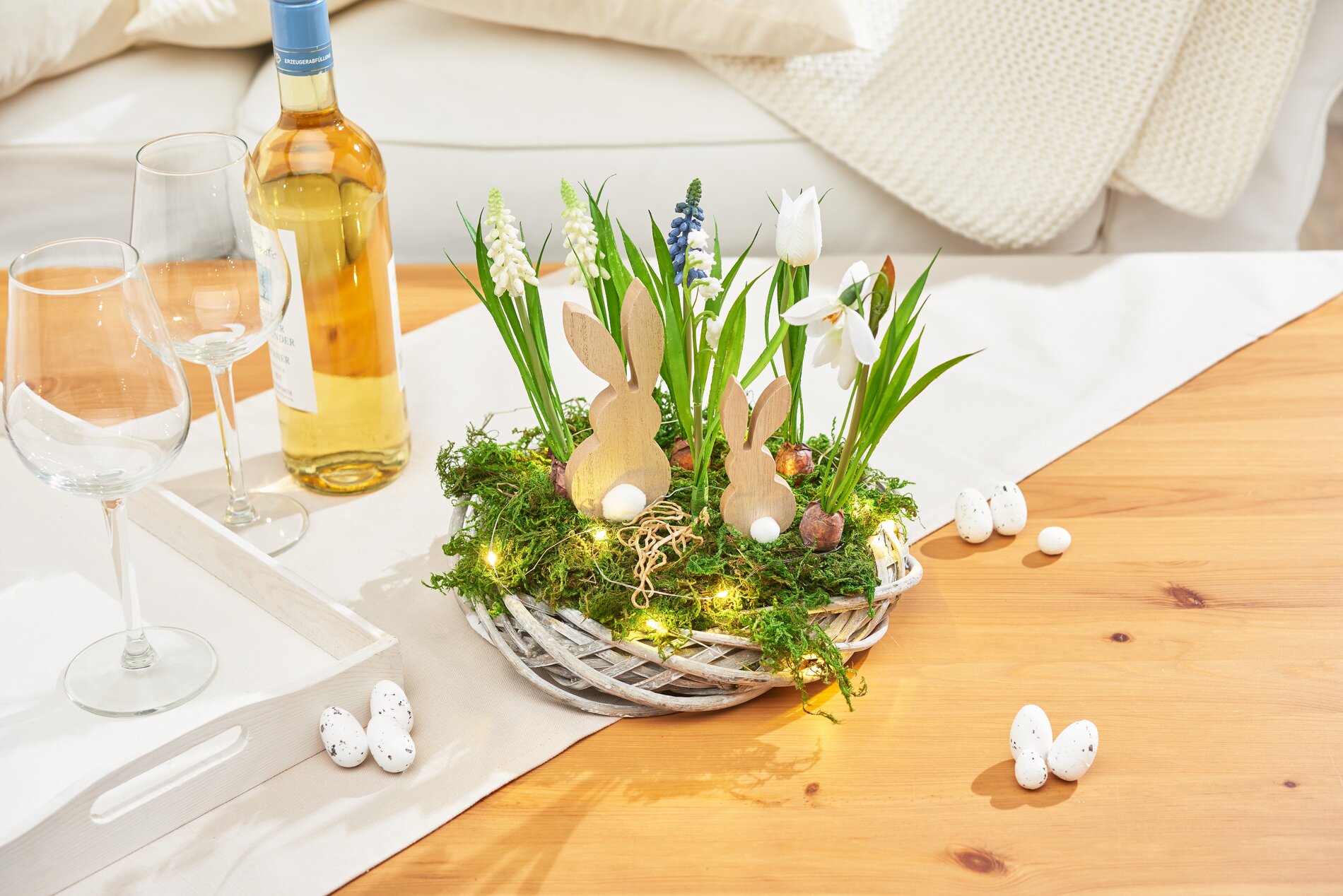 Per dare alla composizione un fascino particolare, mettete un bel filo di luci intorno alla composizione. Le luci calde accentuano i colori dei fiori e creano un'atmosfera invitante.
