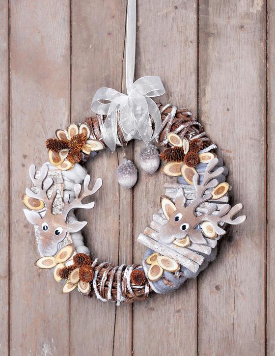 Passare la vernice bianca su un lato della ghirlanda e sui bordi della testa del cervo. Una volta asciutto, avvolgere il cordoncino di feltro intorno alla ghirlanda. Tagliate a metà i bastoncini di cannella con una sega e passate anche qui un po' di vernice bianca. Incollare i bastoncini, le pigne, le fette di corteccia e la corteccia dell'albero. Posizionare gli occhietti e disporre le teste di cervo in modo decorativo prima di fissarle con la colla a caldo. Ora attaccate il nastro di organza come gancio e appendete le ghiande alla ghirlanda.