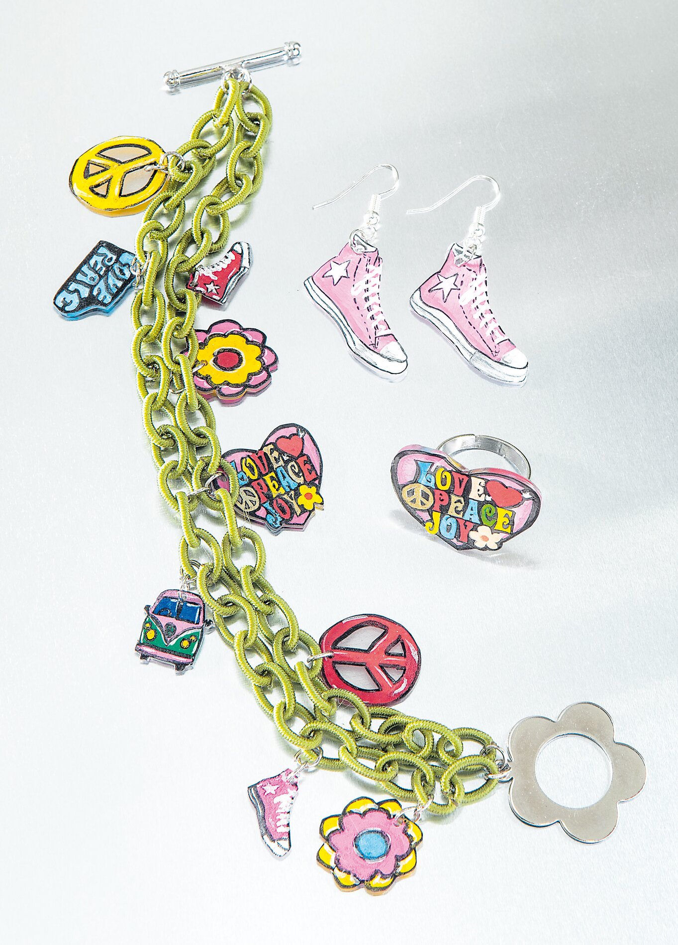 Attaccare gli anelli ai motivi traforati per il braccialetto e gli orecchini e fissarli alla catena a maglie e ai ganci per orecchie con un secondo anello.