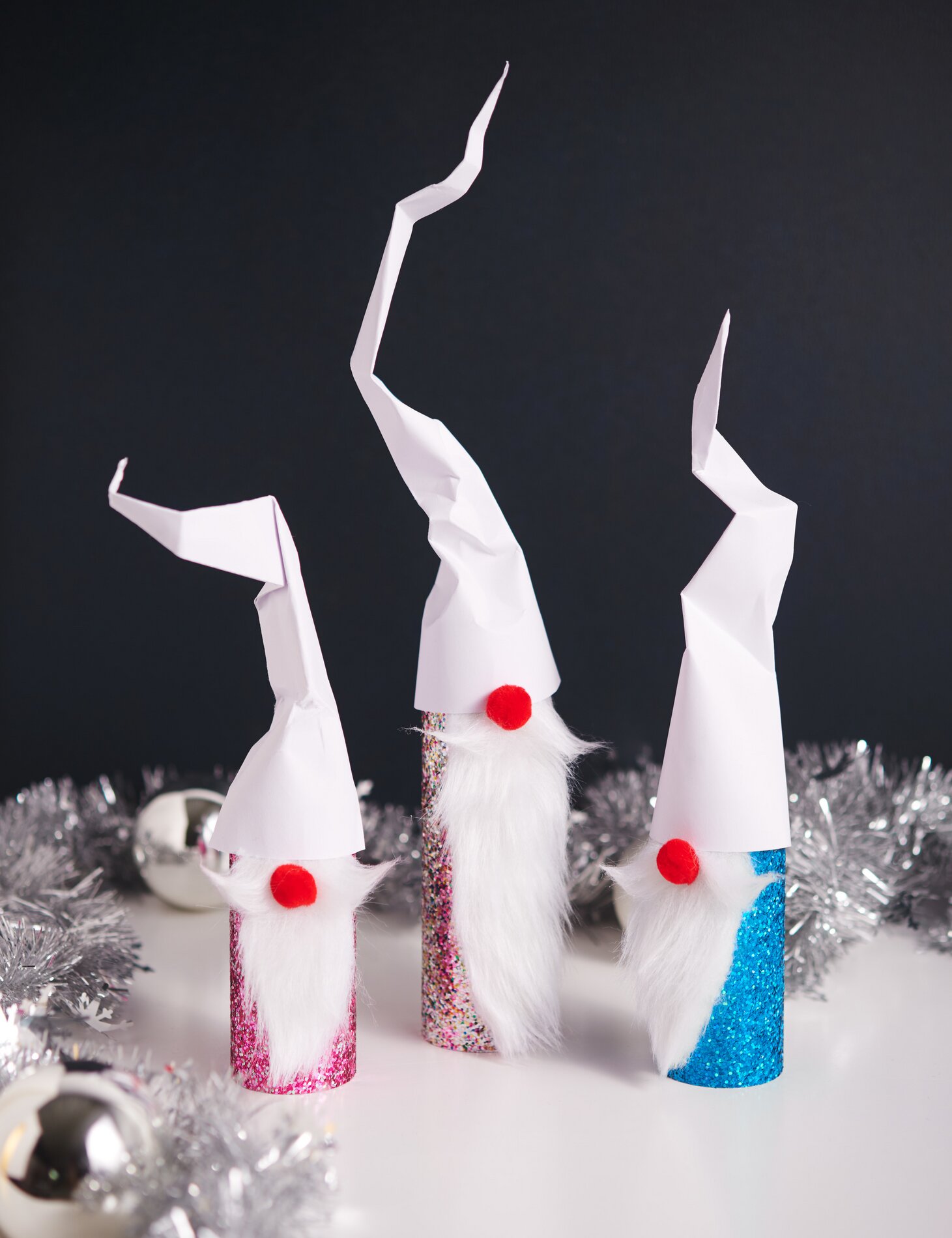 Il corpo dello gnomo è costituito da un semplice rotolo di cartone ricoperto di cartone glitterato. Per tagliare il cartone speciale a misura, fare un piccolo segno con una matita sul bordo del rotolo di cartone. Passare il rotolo sul cartone glitterato per misurare le dimensioni esatte del cartone bianco. Tagliare il cartone a misura e incollarlo sul rotolo di cartone.