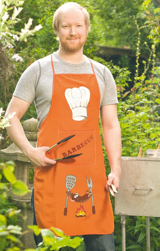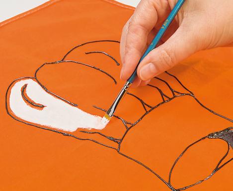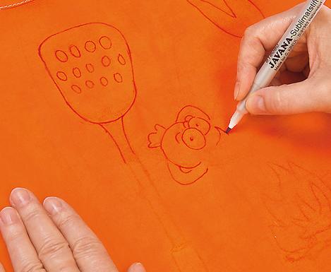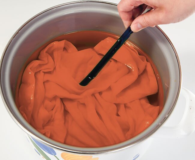 Per il batik, sciogliere metà della polvere colorante e 5 cucchiai di sale da cucina in circa 5 litri di acqua bollente. Sciacquare il grembiule con acqua pulita, quindi immergerlo nella soluzione colorante e tingere per almeno 20 minuti, muovendolo continuamente. Risciacquare il tessuto tinto finché l'acqua di risciacquo non diventa limpida, quindi asciugare e stirare.