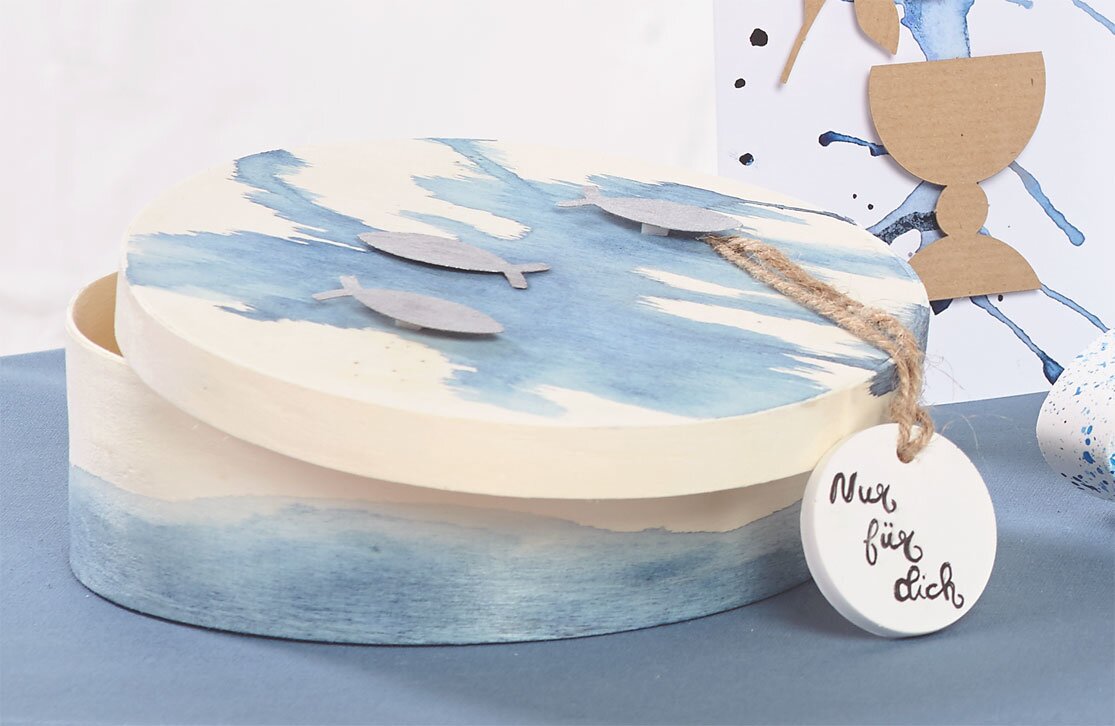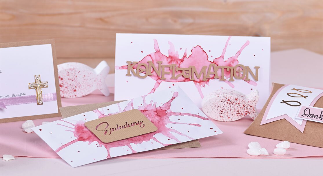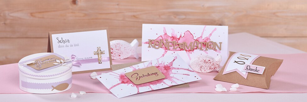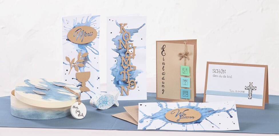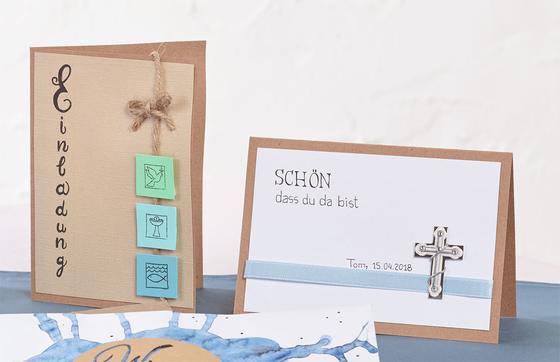 Biglietto d'invito con nastro di iuta  La carta perlata viene prima incollata sul fronte del biglietto doppio. Timbrare i motivi "colomba", "pesce" e "calice". Prendere il timbro in silicone per motivi Clear Stamp, posizionarlo sul supporto e timbrare i motivi su carta colorata.