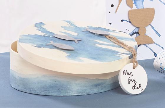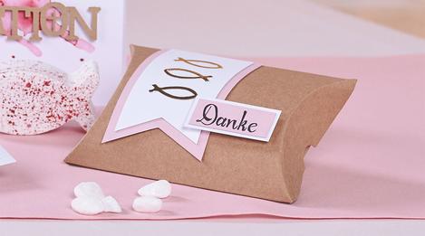 Tagliare i motivi in piccoli cartoncini quadrati. Legare ora un nastro di iuta intorno alla parte anteriore del cartoncino doppio e chiuderlo con un piccolo fiocco decorativo. Incollare i cartoncini con i motivi tagliati sul nastro utilizzando le pastiglie adesive 3D. Il biglietto viene poi etichettato.