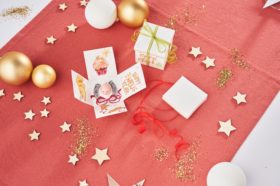 Infine, collochi il maiale o un altro elemento decorativo nella scatola, metta il coperchio e lo fissi con un fiocco decorativo. Per arricciare il nastro, può semplicemente tirarlo con il pollice e un paio di forbici.