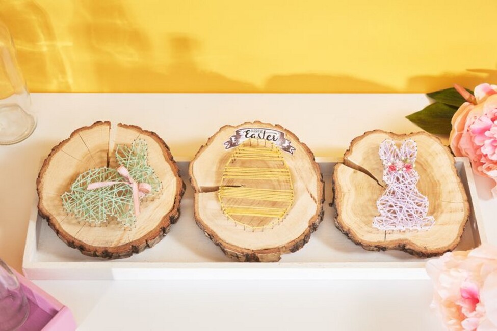 7. Infine, utilizzate i timbri in silicone per creare uno striscione, che potrete etichettare a vostro piacimento. Basta ritagliarlo e incollarlo al disco dell'albero con la colla artigianale. La vostra grande decorazione pasquale è pronta.