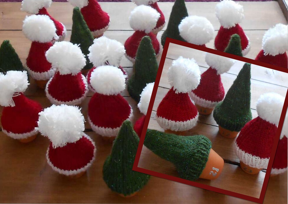 Con la lana bianca e una macchina per pompon, realizzare i piccoli pompon sui cappelli di Babbo Natale. Con una penna argentata disegnare i numeri del calendario dell'Avvento sui vasi di argilla, riempirli di piccole sorprese e metterci sopra i cappelli lavorati a maglia. Il calendario dell'Avvento è finito.
