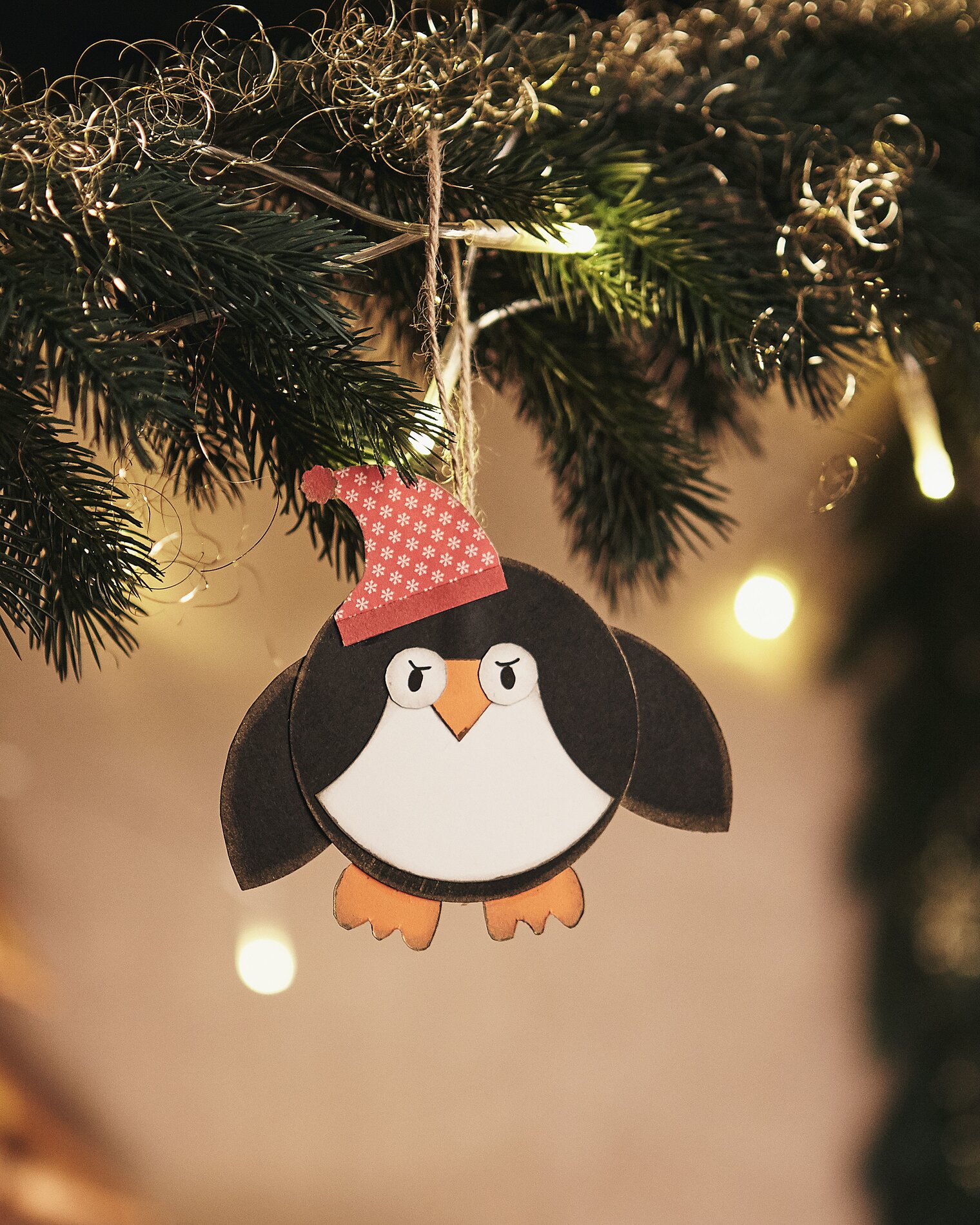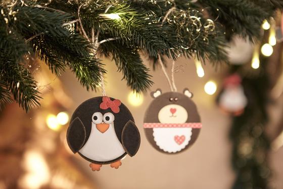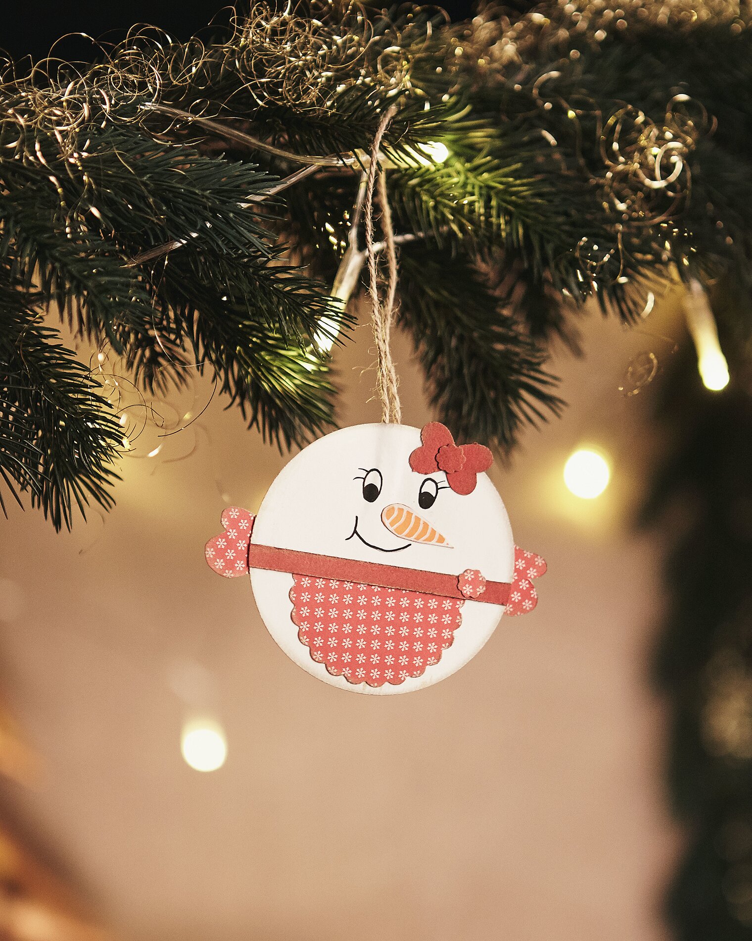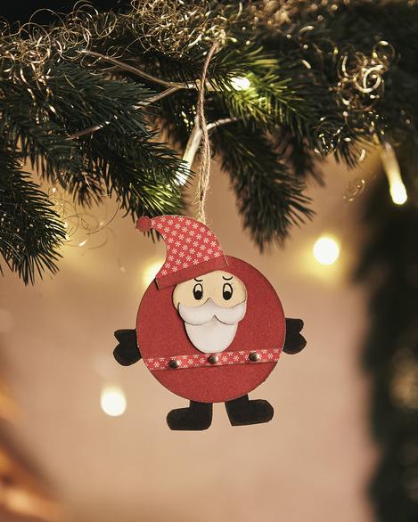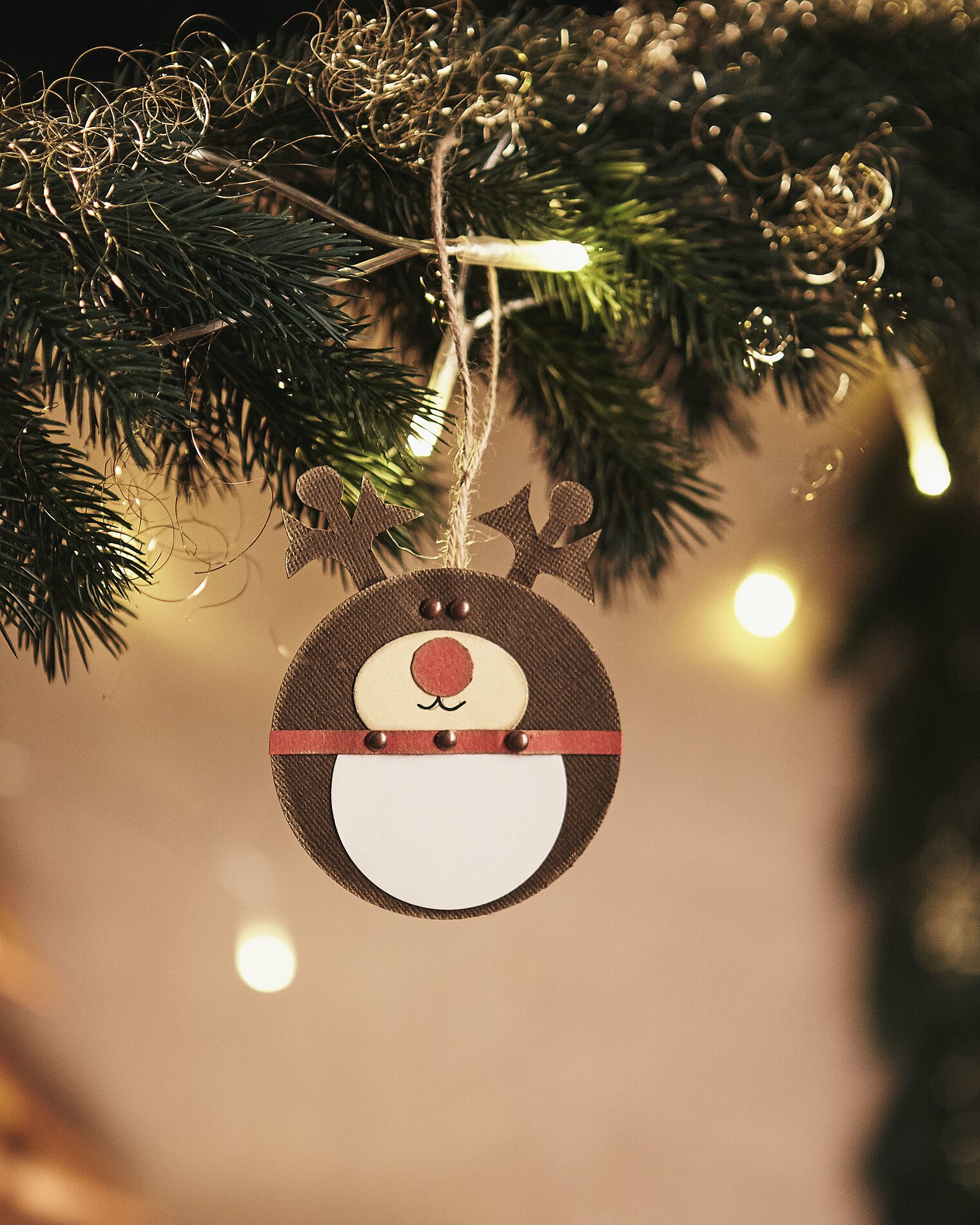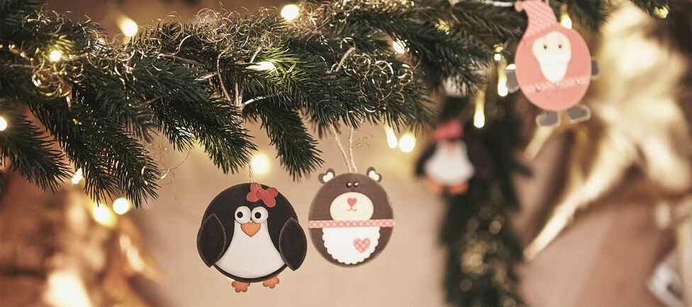 Le forme di base di tutti gli ornamenti per l'albero di Natale sono state fustellate con le fustelle per motivi. Per le singole figure sono necessarie le seguenti fustelle: Pupazzo di neve - fustella motivo cerchio 5 cm Pinguino - fustella motivo cerchio 5 cm, ovale 3,8 cm Renna - fustella motivo cerchio 5 cm, cerchio 2,8 cm, ovale 2,5 cm Donna delle nevi - motivo punzonatura cerchio 5 cm, cerchio dentellato 2,5 cm Babbo Natale - motivo punzonatura cerchio 5 cm Donna orso - motivo punzonatura cerchio 5 cm, cerchio dentellato 2,5 cm, ovale 2,5 cm, cuore 8x9 mm