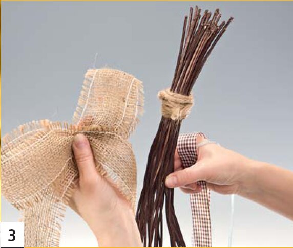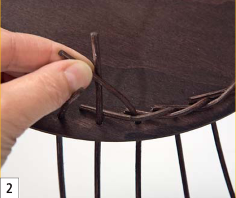 Piegare con cura le estremità e intrecciare a ritmo di "prima uno, dietro uno", cioè ogni filo gira intorno all'esterno del successivo e rimane all'interno dietro l'altro, in modo che i fili si tengano in posizione dopo l'asciugatura (vedi figura 2).
