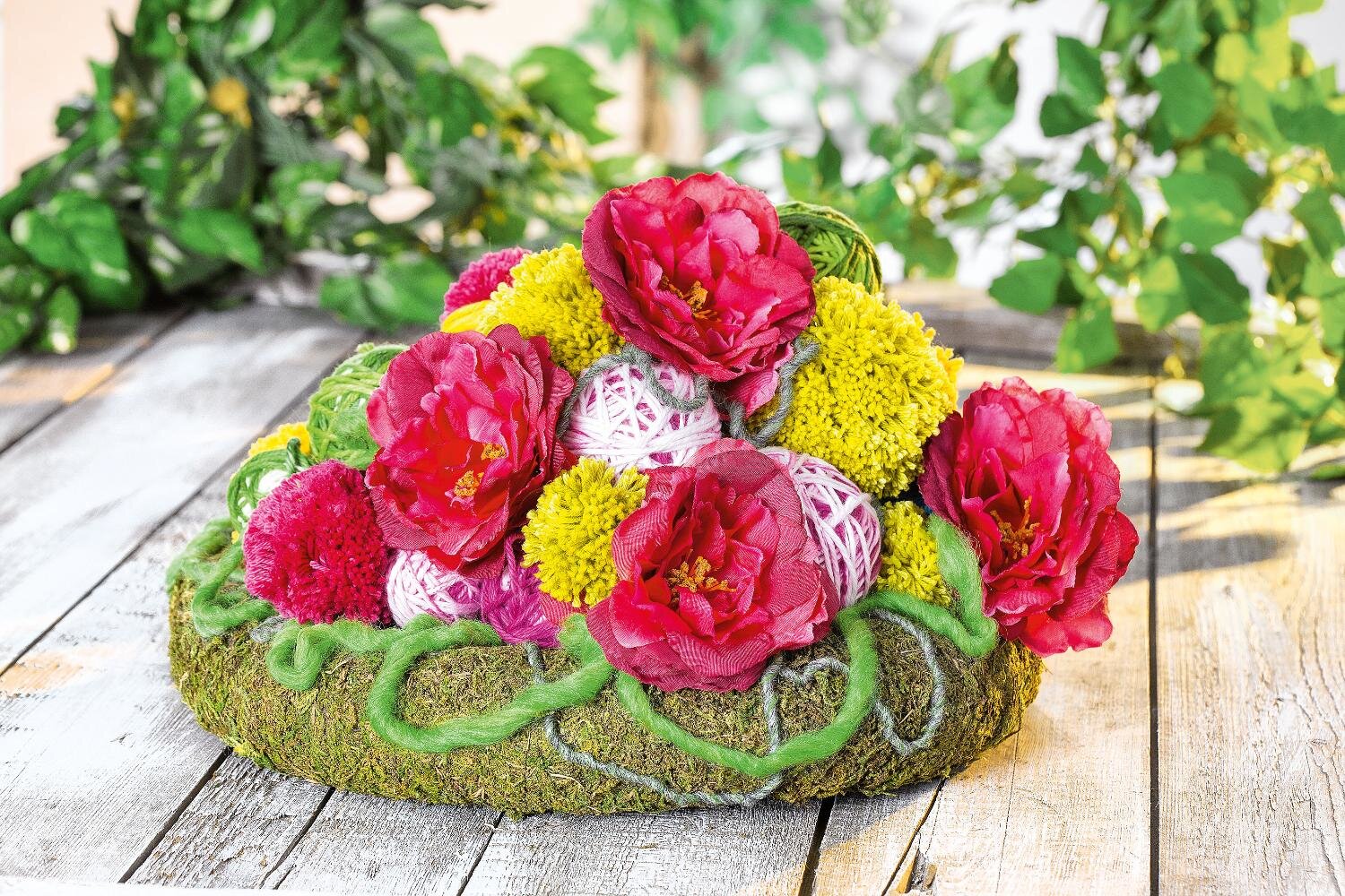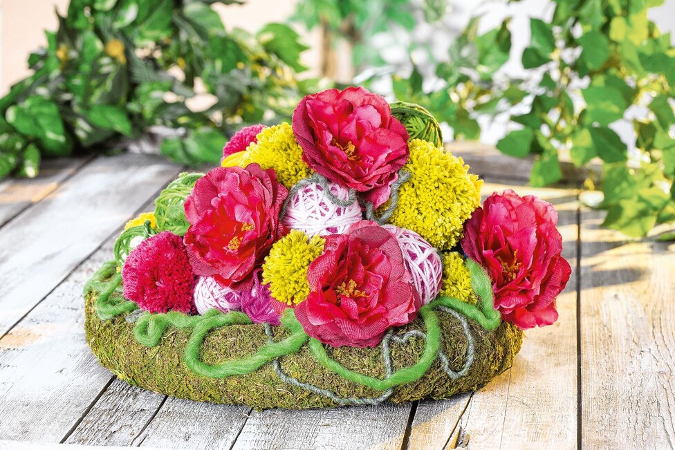 Ora potete disporre le palline di lana colorate e i pompon a piramide sulle ghirlande di muschio con l'aiuto di fili di spine. Infine, tagliate i gambi delle rose con un cutter laterale e aggiungete i fiori alla vostra composizione creativa.