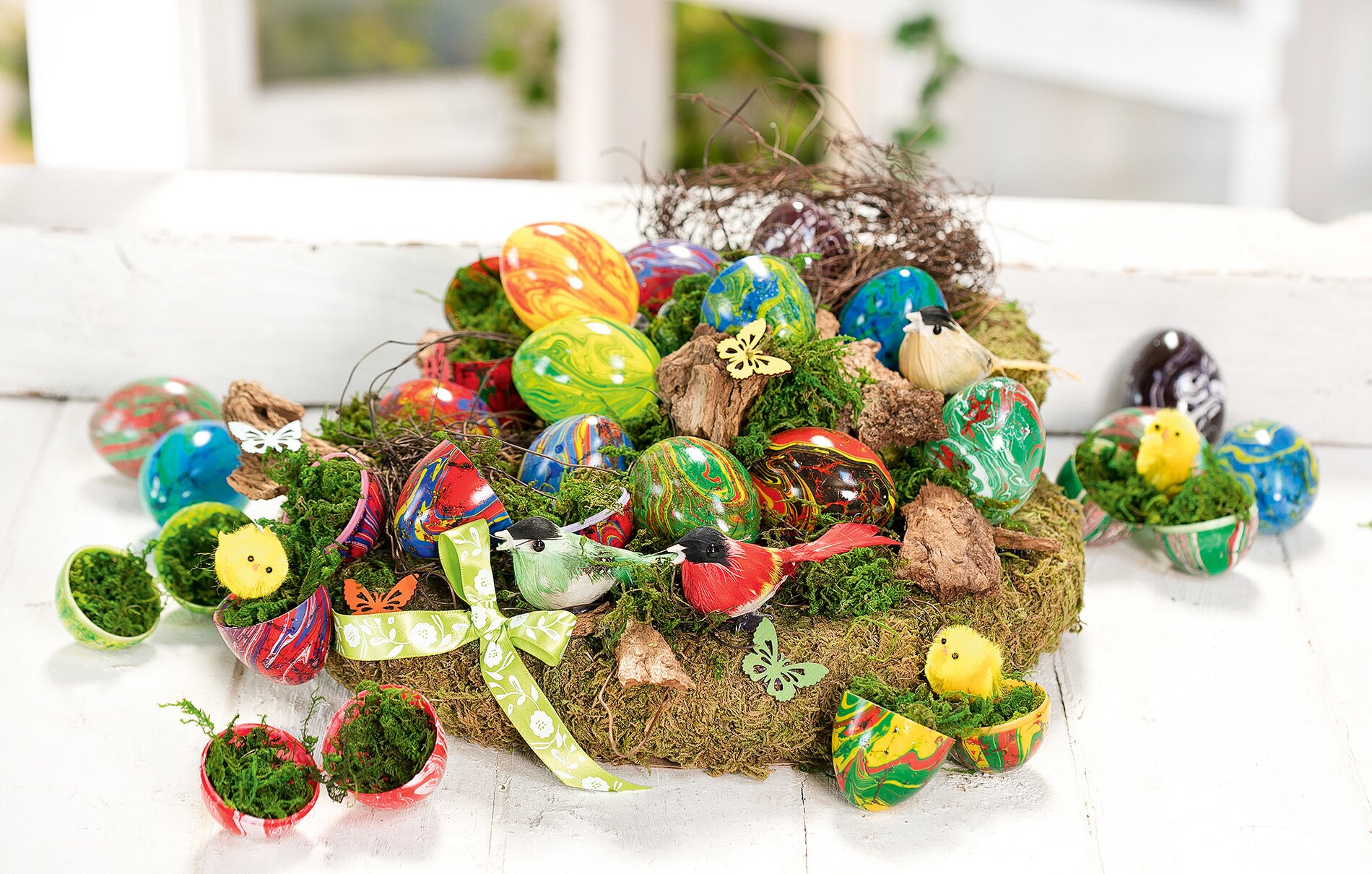 Come si fa il nido di Pasqua? Mentre le uova marmorizzate si asciugano, si può iniziare a realizzare il nido di Pasqua. Per farlo, coprite entrambe le ghirlande di muschio con del cartone dalla parte inferiore, incollate la ghirlanda più piccola su quella grande e riempitela con il muschio verde scuro.