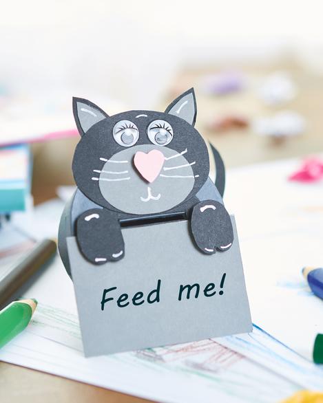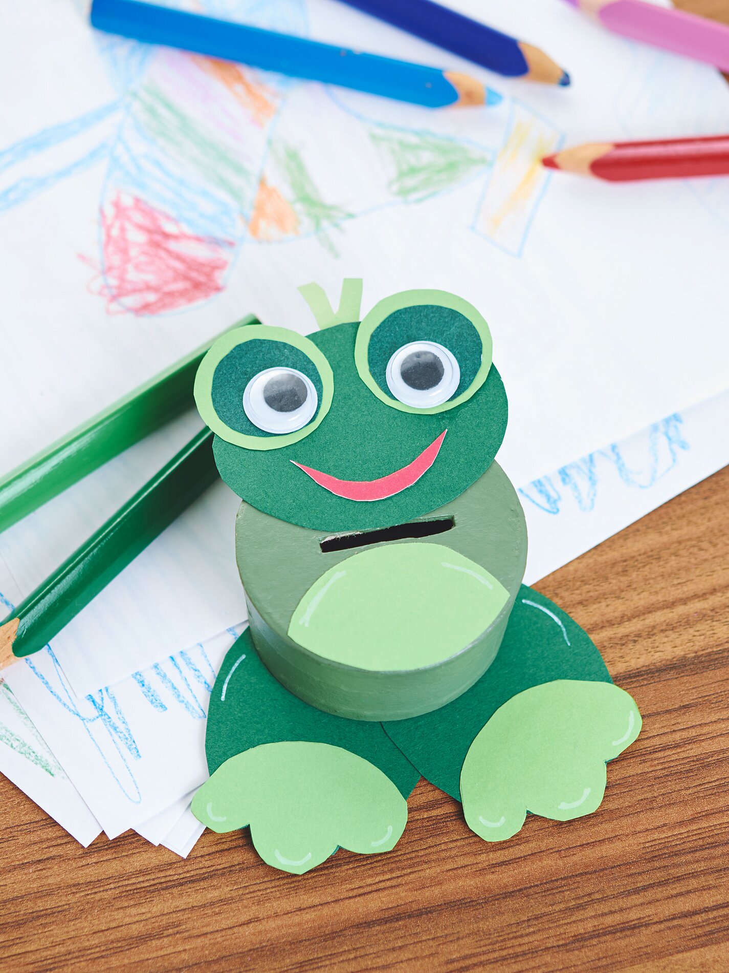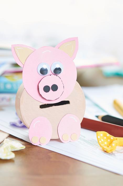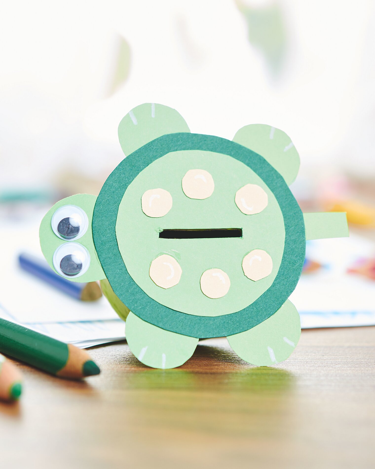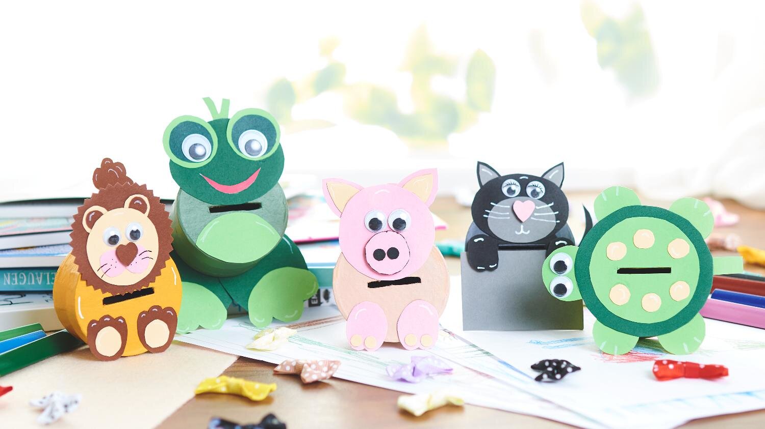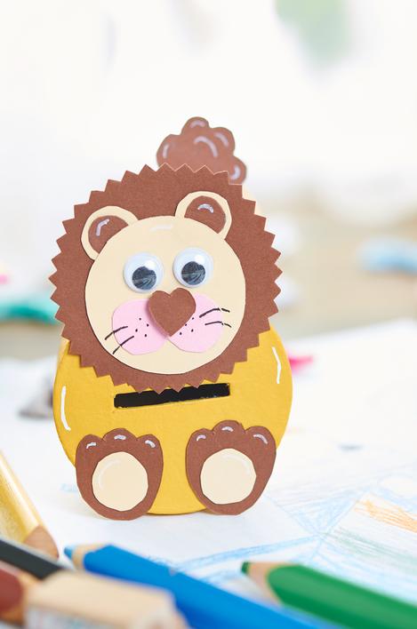 Per realizzare le teste e le zampe, scaricare il modello del motivo, trasferire le varie forme su carta colorata o cartoncino fotografico e ritagliarle. Incollare i singoli pezzi del motivo e poi attaccarli al salvadanaio.