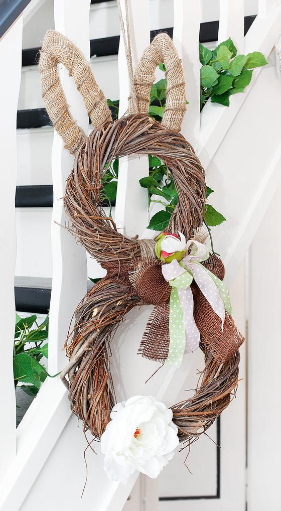 Come si realizza il coniglietto di Pasqua in salice? Legate insieme le due ghirlande con un cordoncino di juta e fissatele con la colla a caldo. Stampate il modello, trasferitelo su un pezzo di cartone e ritagliate le orecchie. Avvolgete il nastro di iuta intorno alle orecchie di cartone e fissate nuovamente le estremità con la colla a caldo. Ora legate la juta scura in un grande fiocco e i nastri colorati in un fiocco leggermente più piccolo. Posizionare i fiocchi sul collo del coniglietto, cioè nel punto in cui si uniscono le due ghirlande. Infine, attaccate le rose.
