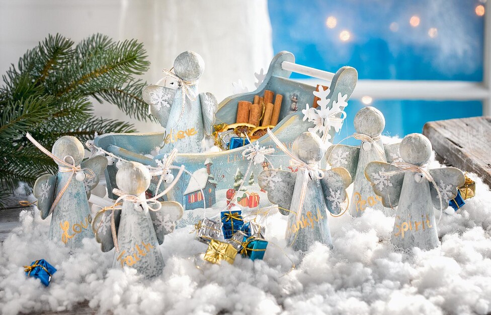 Gli angeli e la slitta vengono prima trattati con la vernice VBS Chalky Colour nel colore blu antico. Il colore può essere asciugato rapidamente con aria calda. Per ottenere l'effetto gessoso, tutto viene ricoperto con uno strato di Chanky Wax. Una volta asciugato anche questo mezzo di colore, tutto viene ricoperto con un altro strato di vernice Chalky Color (bianco antico). A questo punto, rimuovere con cura la vernice asciutta in alcuni punti con la carta vetrata: in questo modo si ottiene il tipico effetto gessoso raffinato.