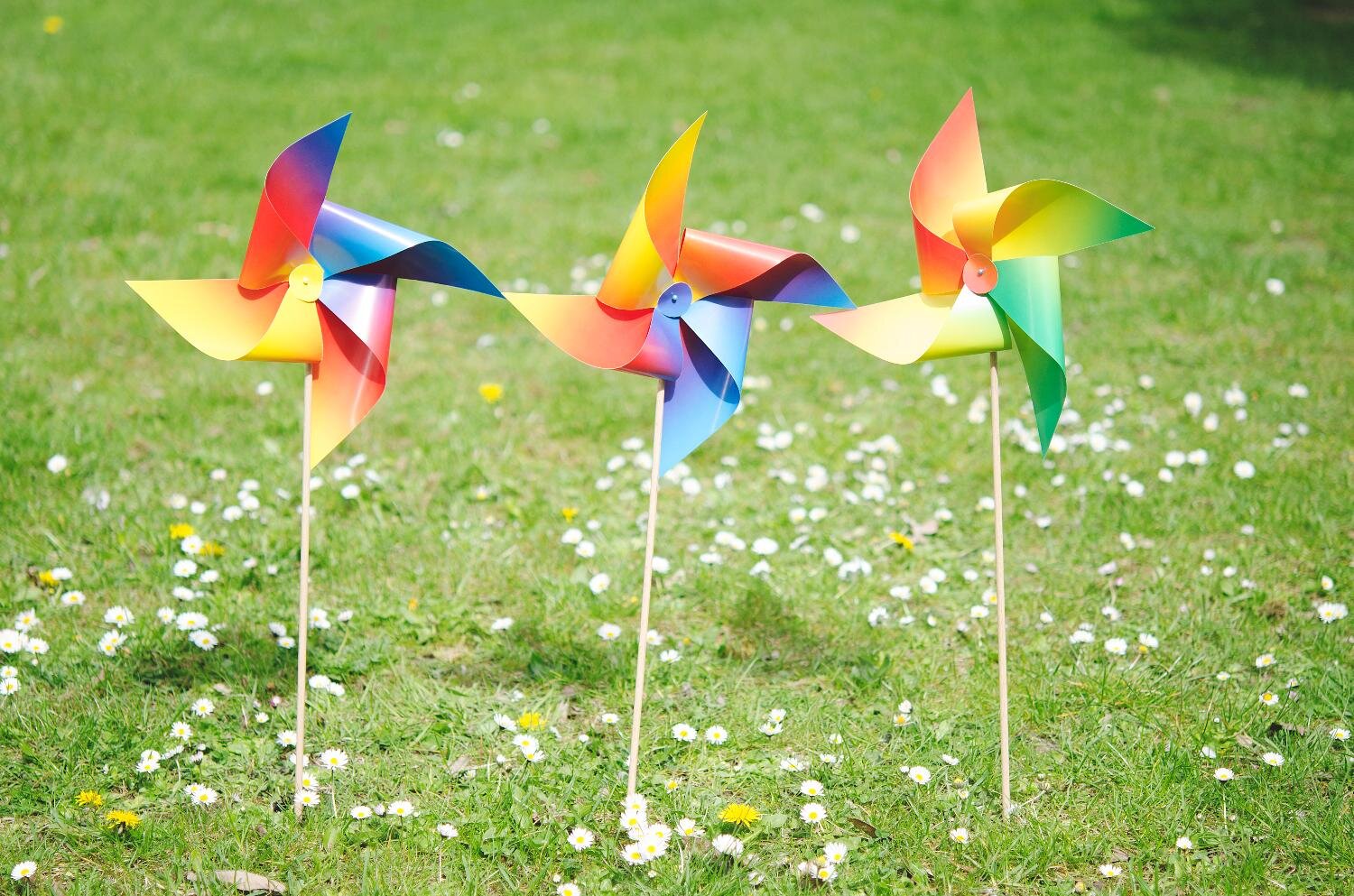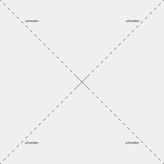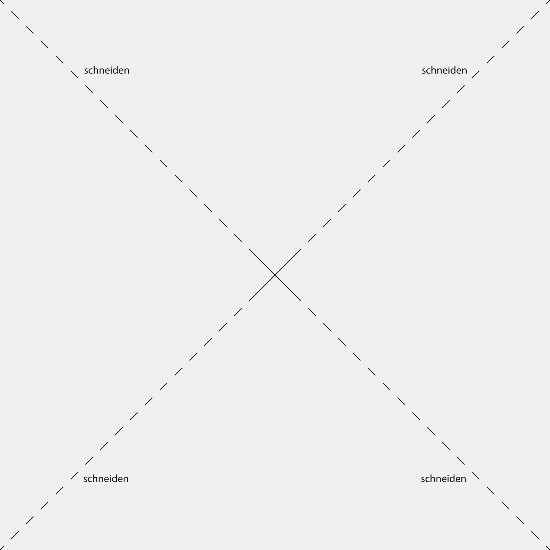 Ritagliare dal cartoncino arcobaleno un quadrato per ogni girandola, delle dimensioni di 22 x 22 cm. Con il righello, tracciare due linee da un angolo all'altro del quadrato in modo da segnare esattamente il centro del foglio, tagliare le punte a una distanza di 2,5 cm dal centro utilizzando le linee tracciate.