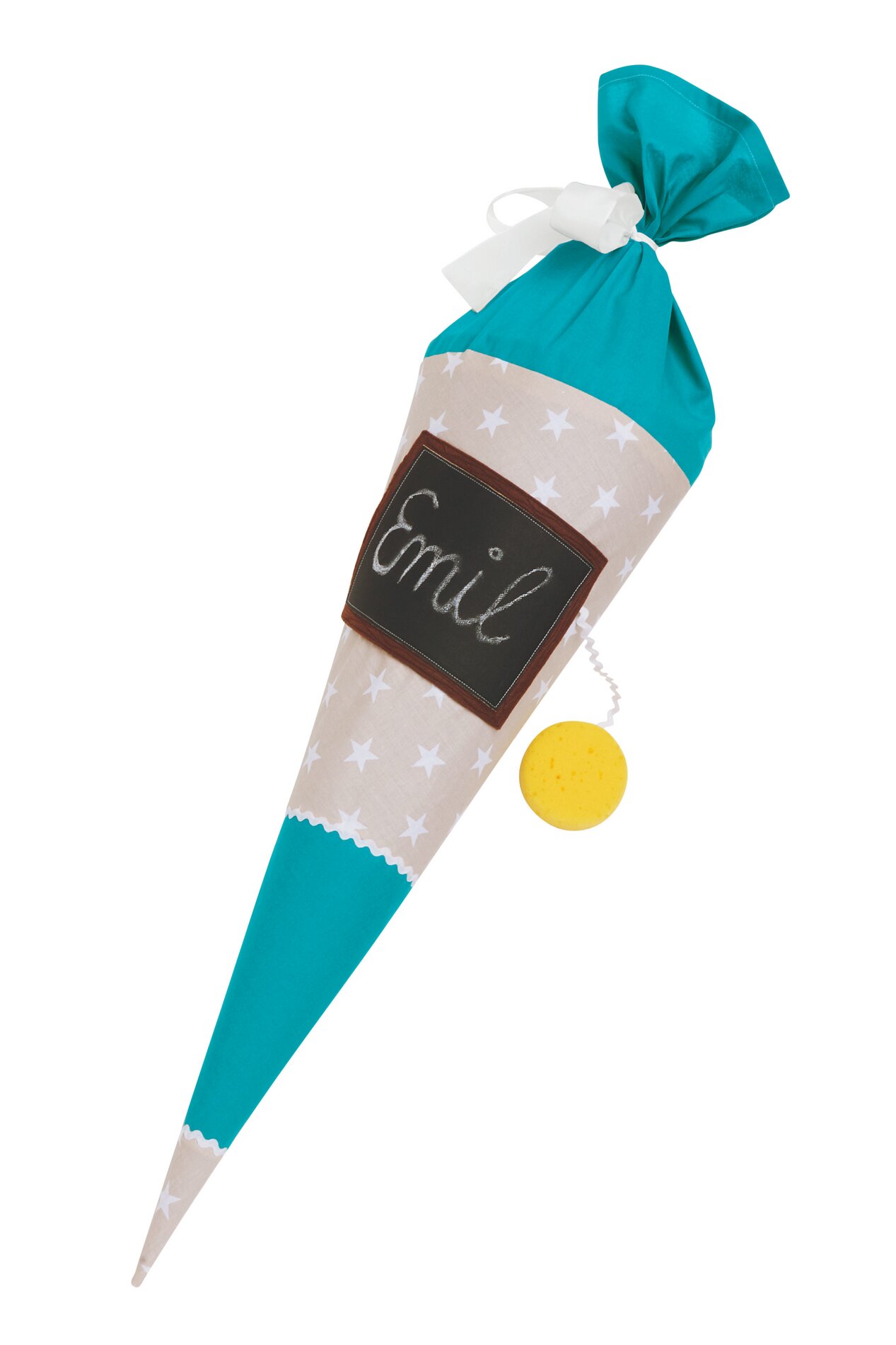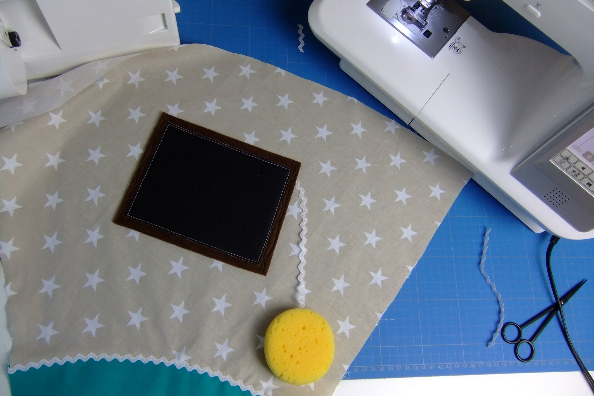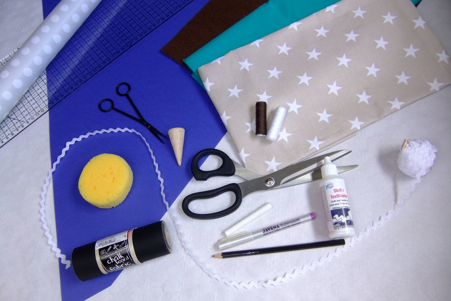 1 cono scuola fustellato, 1 punta di legno per il cono scuola, circa 60 cm di tessuto a stelle, circa 68 cm di tessuto di cotone liscio, 1 pannello di feltro marrone, un po' di tessuto lavagna, tessuto ricamato o il motivo da applicare, nastro dentellato e una spugna.