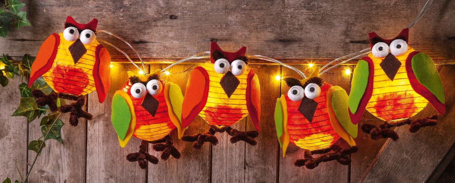 Una divertente catena luminosa a forma di gufo realizzata con paralumi per la vostra casa.