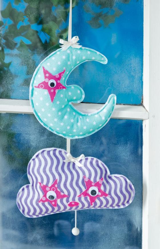 Cucite insieme la luna e la nuvola. Cucire un nastro di raso per tenere insieme le due parti. Cucite una gruccia e un piccolo fiocco di raso in cima e infine incollate gli occhietti.