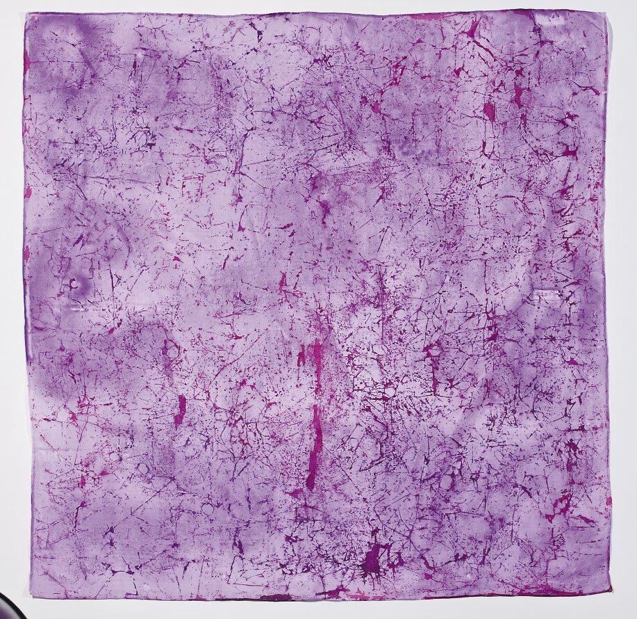 Montare il telaio di seta a circa 90 x 90 cm, mascherare i legni con nastro crespato. Sciacquare il panno di seta in acqua pulita, strizzarlo in un asciugamano e stenderlo sul telaio di seta. Diluire molto la vernice di seta viola (1 parte di vernice per 20 parti di acqua) e spruzzare sul panno con la bottiglia a spruzzo. Se necessario, tendere il panno sul telaio. Sciogliere le perle di cera a bagnomaria e applicarle sulla superficie del panno di seta essiccato con un pennello a setole larghe. Lasciare che la cera si raffreddi completamente, togliere il panno e sgualcirlo energicamente in modo da far apparire delle crepe nello strato di cera. Eliminare con cura la cera sciolta, tendere nuovamente il panno e applicare il colore di seta non diluito. Una volta che il colore si è asciugato, togliere il panno dal telaio e rimuovere completamente la cera con un ferro da stiro tra diversi strati di carta di giornale. Continuare a sostituire il giornale man mano che si satura. Quindi fissare il colore di seta con il ferro da stiro a temperatura di cotone. Lavare il panno, strizzarlo in un asciugamano e stirarlo a secco.