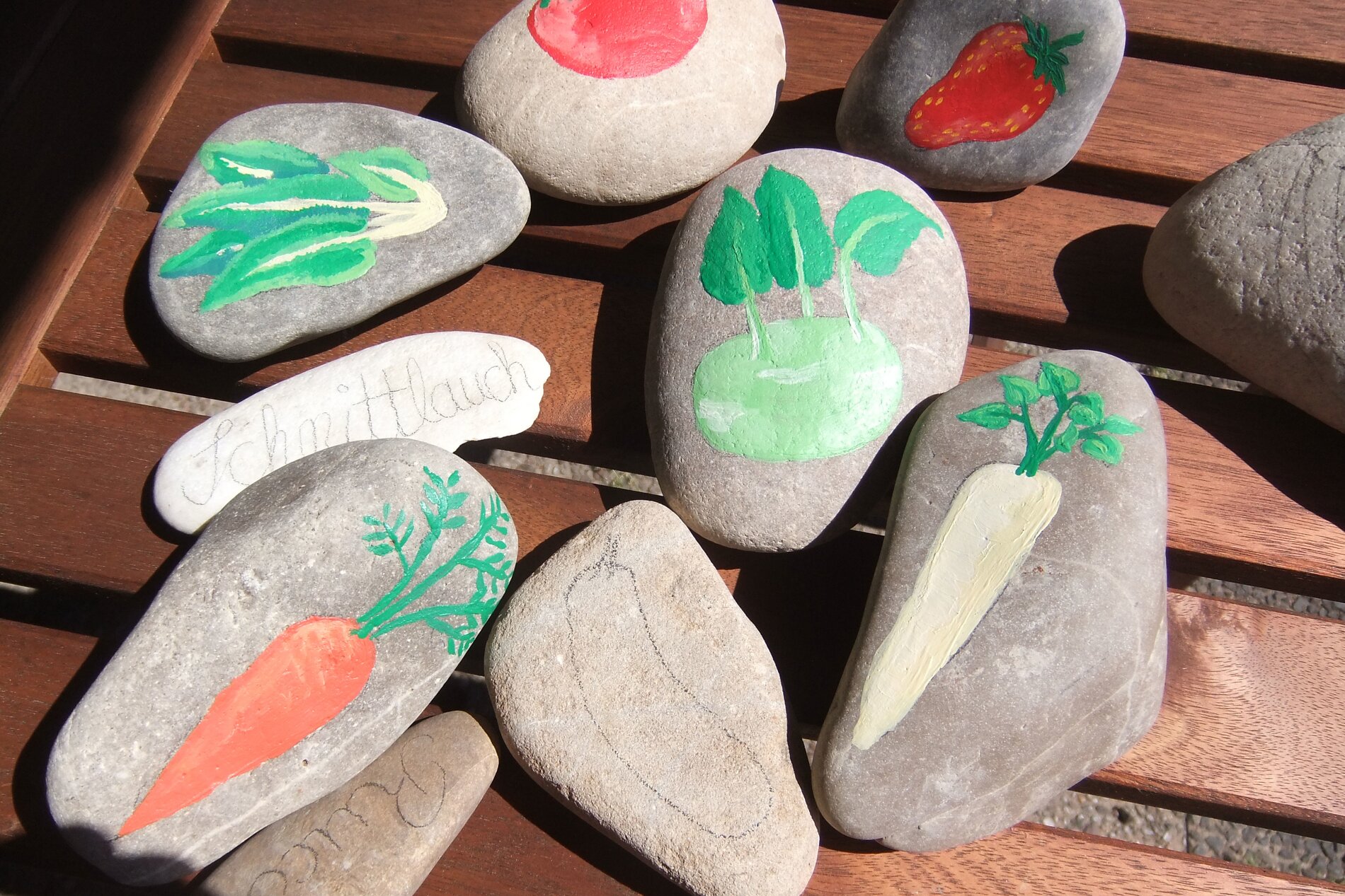 Innanzitutto, è necessario selezionare con cura le pietre. Prestate attenzione alla forma delle pietre per trovare i motivi adatti. I noccioli allungati sono perfetti per le carote o i cetrioli, mentre quelli più larghi sono ideali per il cavolo rapa. Pulite accuratamente i noccioli e abbozzate i motivi desiderati con una matita. Non esitate a utilizzare i modelli presenti su Internet o a dare sfogo alla vostra immaginazione!
