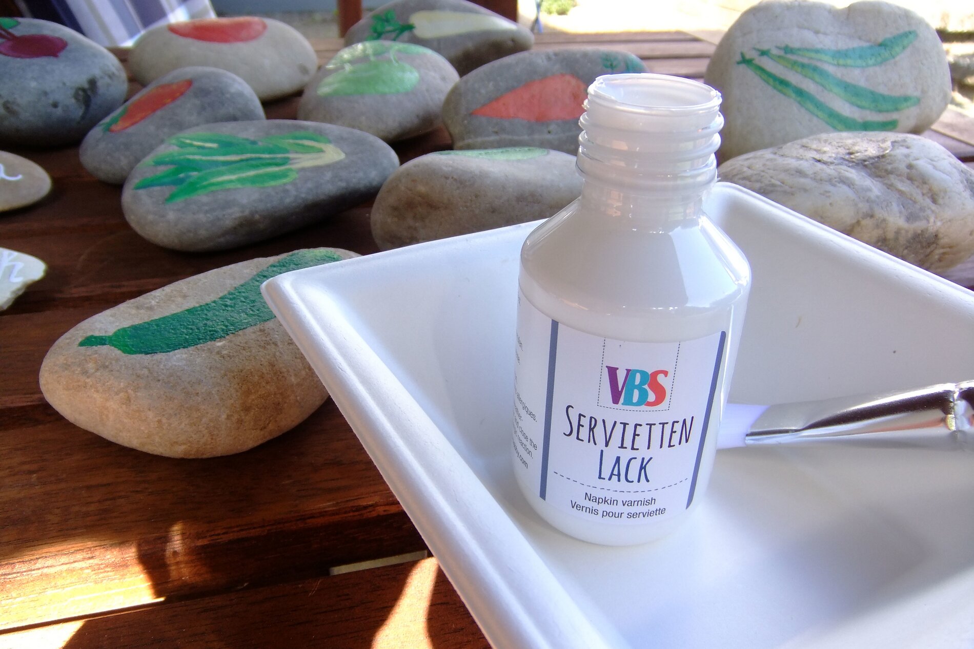 Sebbene i colori per esterni siano resistenti alle intemperie, consigliamo di sigillare le pietre con la vernice per tovaglioli per una maggiore protezione. A tal fine, applicare due strati sottili e lasciarli asciugare completamente. In questo modo non solo si aumenta la durata dei colori, ma si ottiene anche un bellissimo effetto leggermente lucido, facile da pulire.