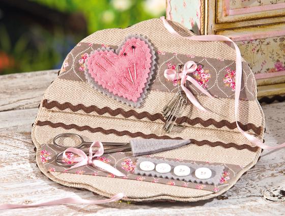 Per l'interno dell'astuccio da cucito, ritagliare varie forme dal feltro su cui attaccare aghi, bottoni, ecc. Incollatele a piacere e decorate l'astuccio finito con nastro bianco a zig-zag, pizzo e rose di raso. I fiori grandi sono particolarmente belli se li si ritaglia dal tessuto e li si attacca all'esterno con il ferro da stiro.